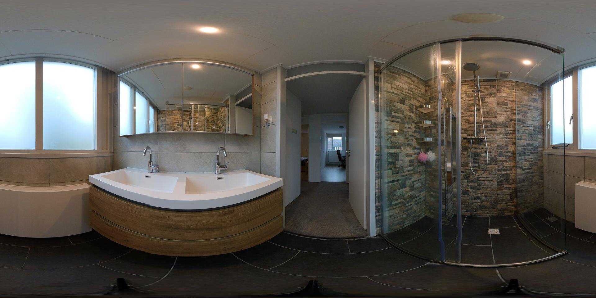 Overloop met drie ruime slaapkamers en een verzorgde badkamer, uitgerust met douche en een dubbele wastafel.