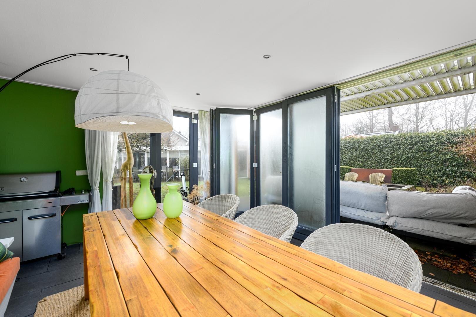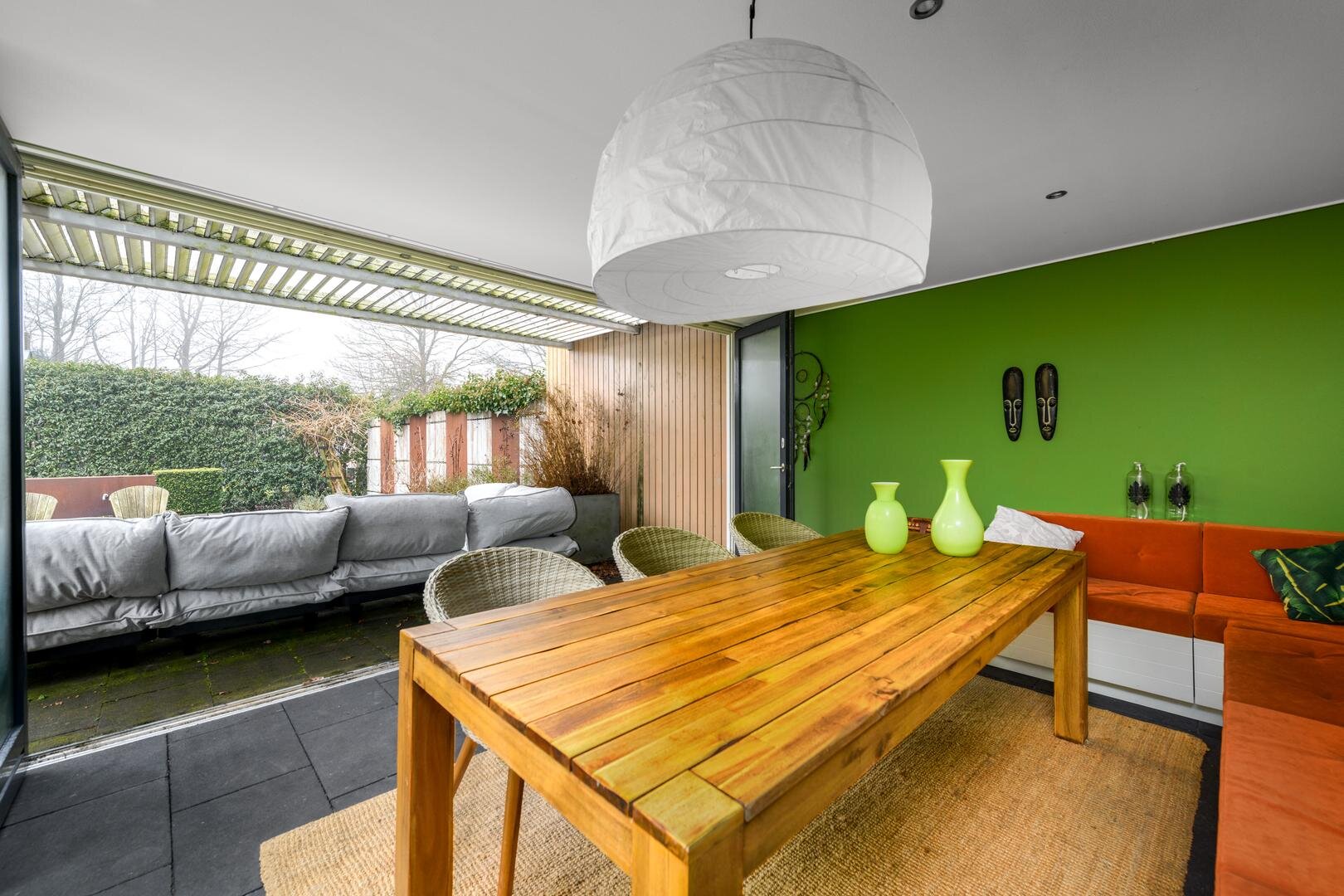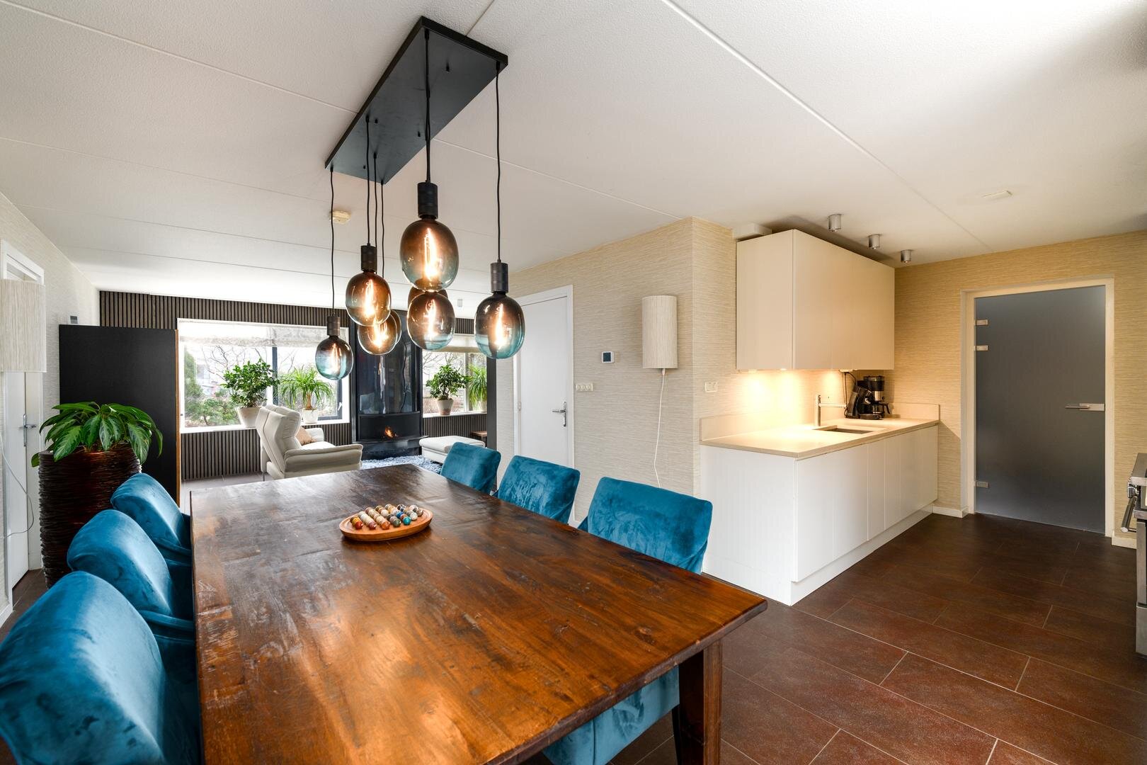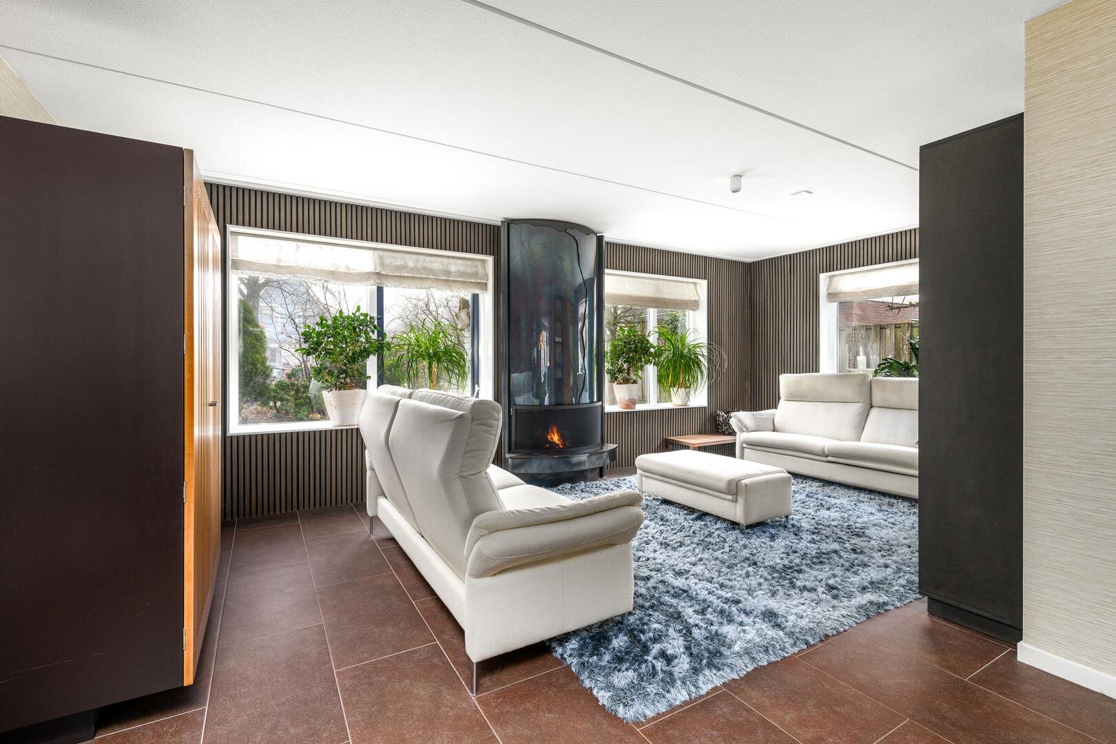 De living is in een U-vorm en met een rookkanaal en design haard. De eethoek heeft alle ruimte centraal in het huis en grenst aan de luxe keuken met inbouwapparatuur en Quooker. In de aanbouw van 2008 is een grote tuinkamer gerealiseerd met zicht op de tuin en met een grote schuifdeur naar het terras. Dit is de ultieme plek om aan het eind even de dag neer te strijken en weg van alles te zijn.