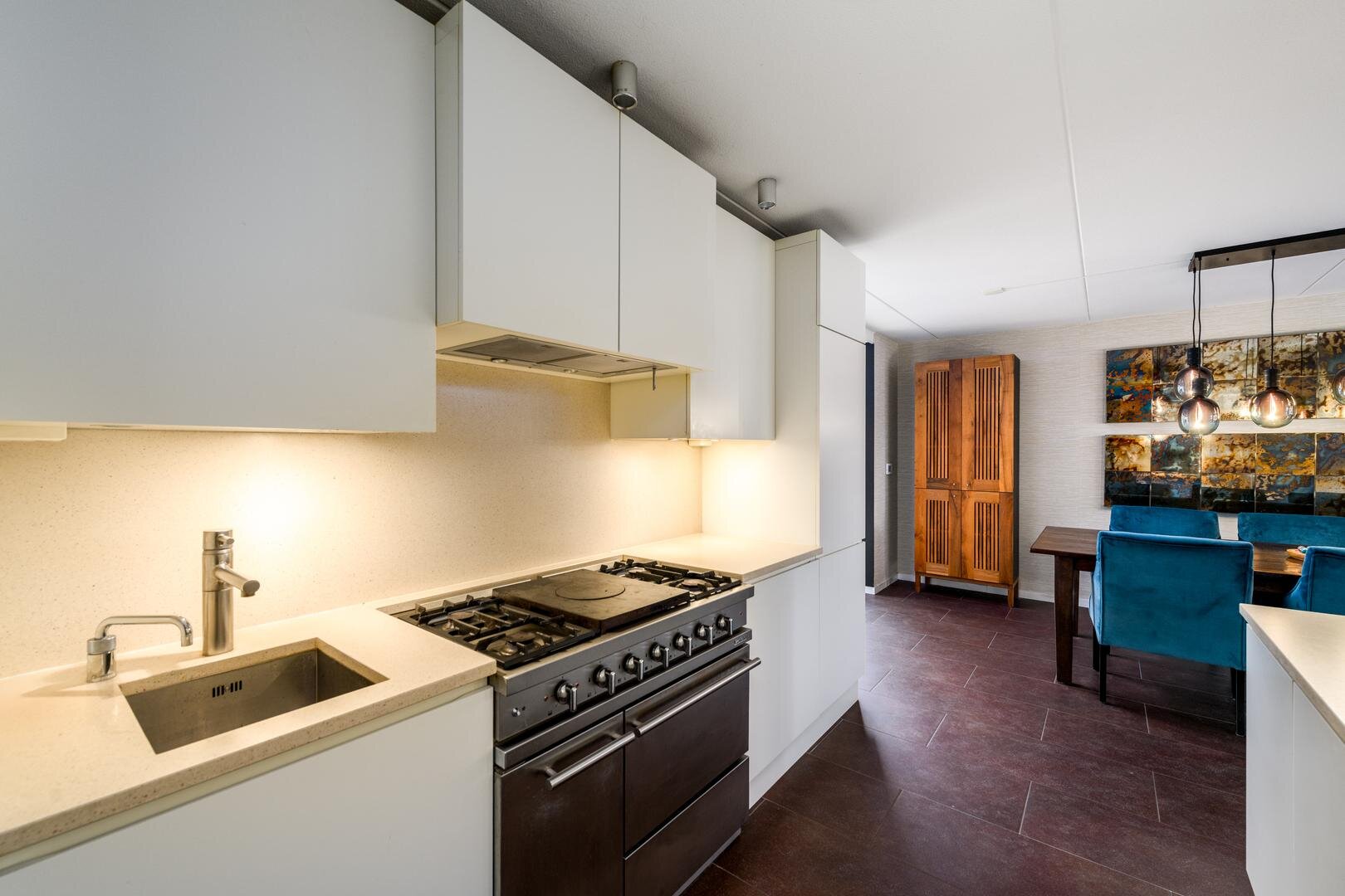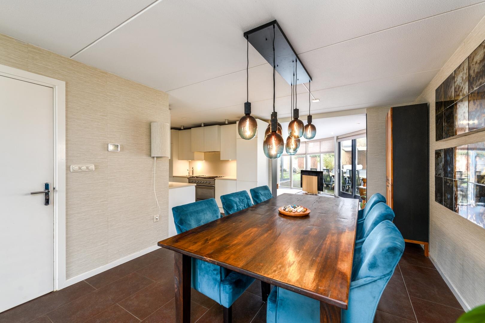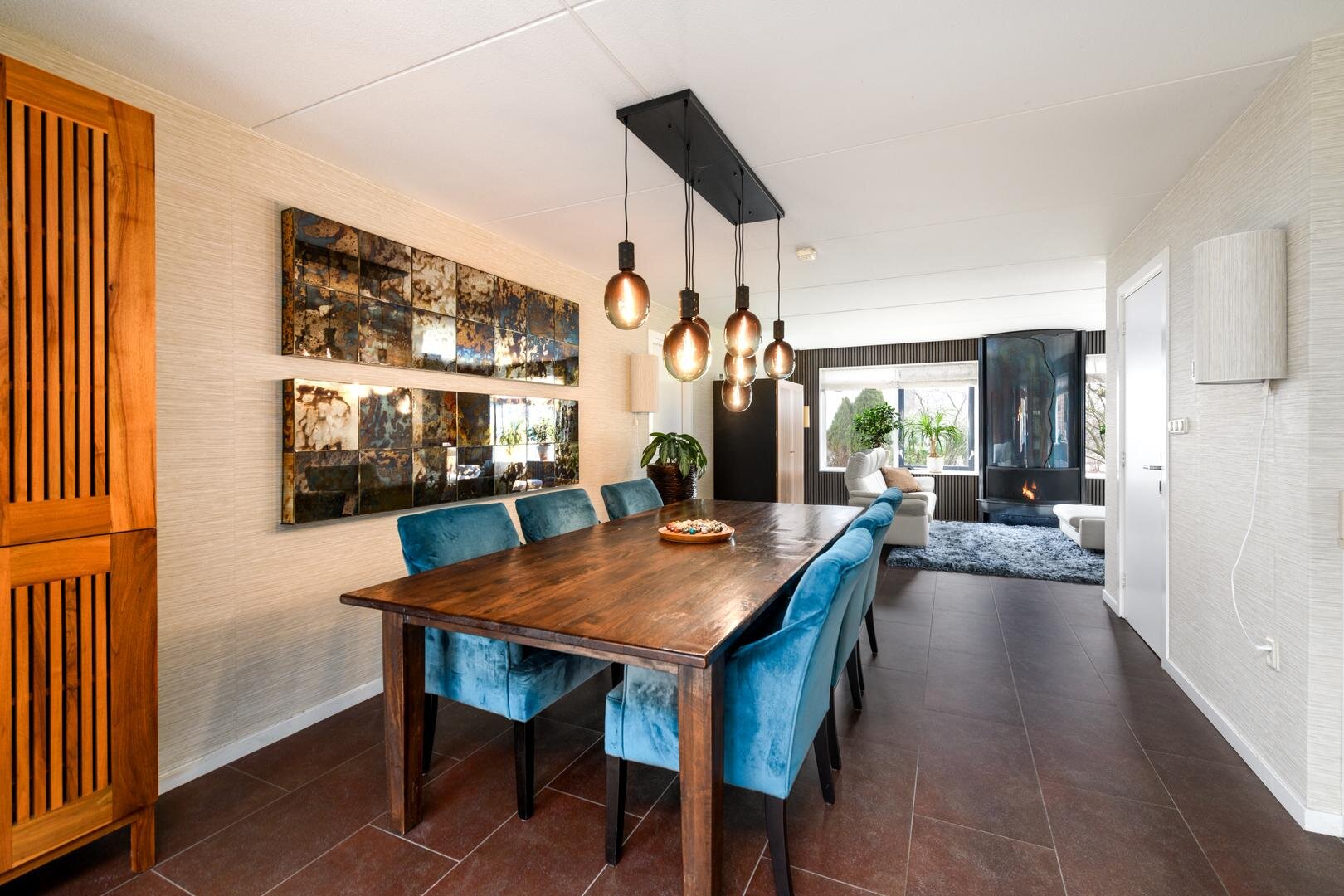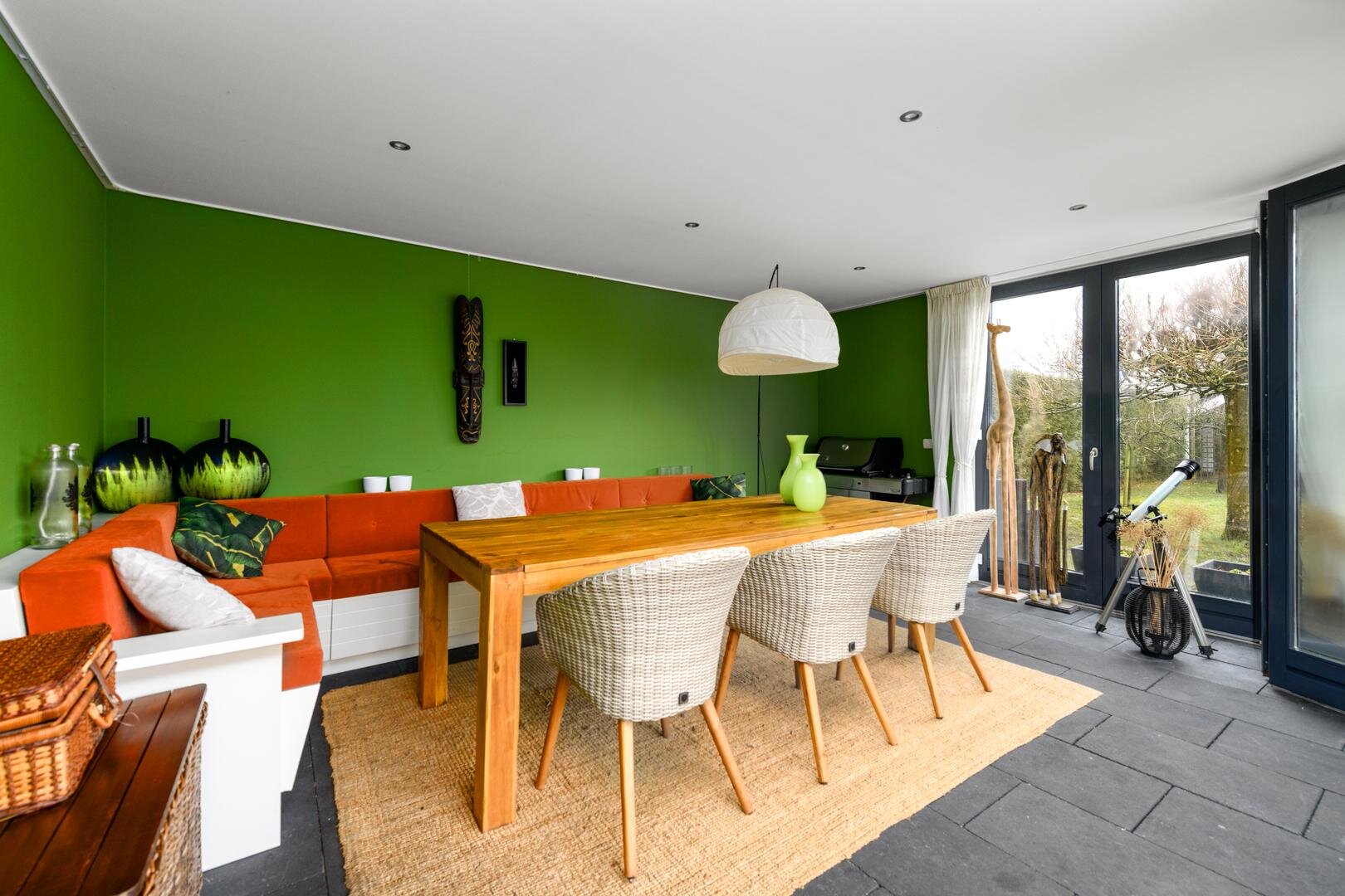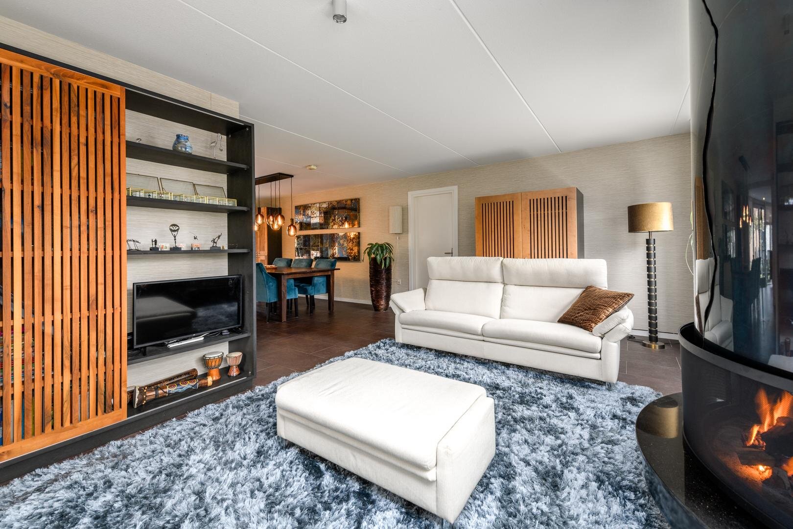 De living is in een U-vorm en met een rookkanaal en design haard. De eethoek heeft alle ruimte centraal in het huis en grenst aan de luxe keuken met inbouwapparatuur en Quooker. In de aanbouw van 2008 is een grote tuinkamer gerealiseerd met zicht op de tuin en met een grote schuifdeur naar het terras. Dit is de ultieme plek om aan het eind even de dag neer te strijken en weg van alles te zijn.