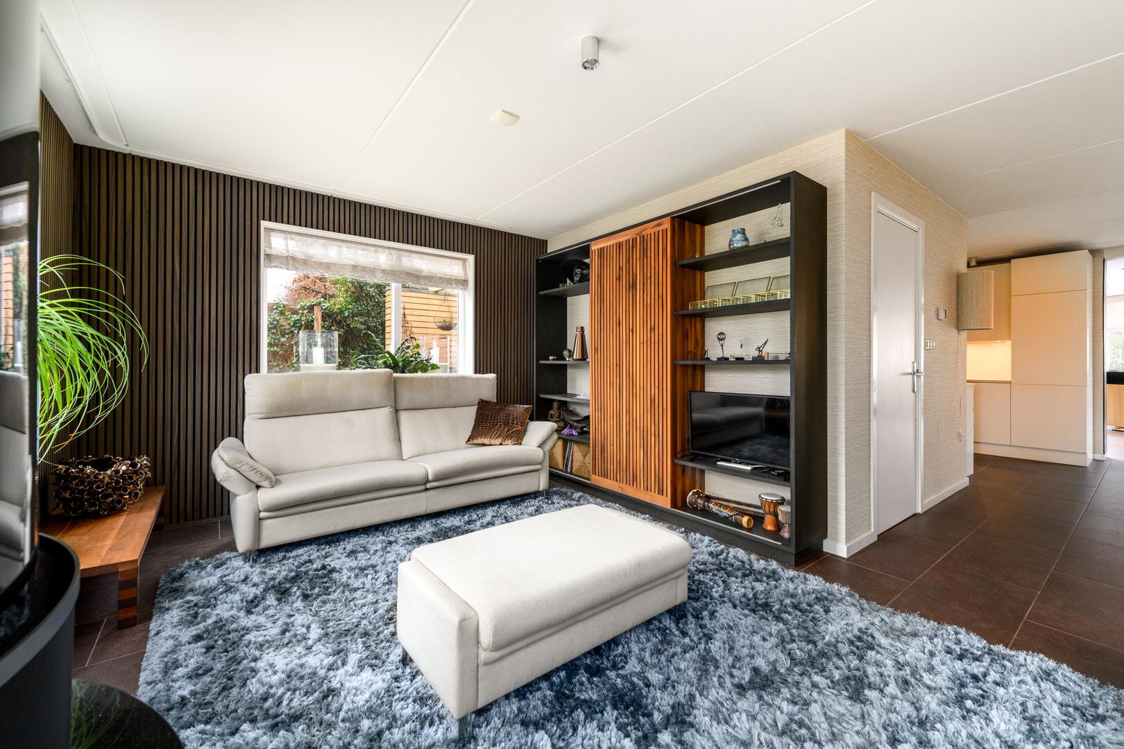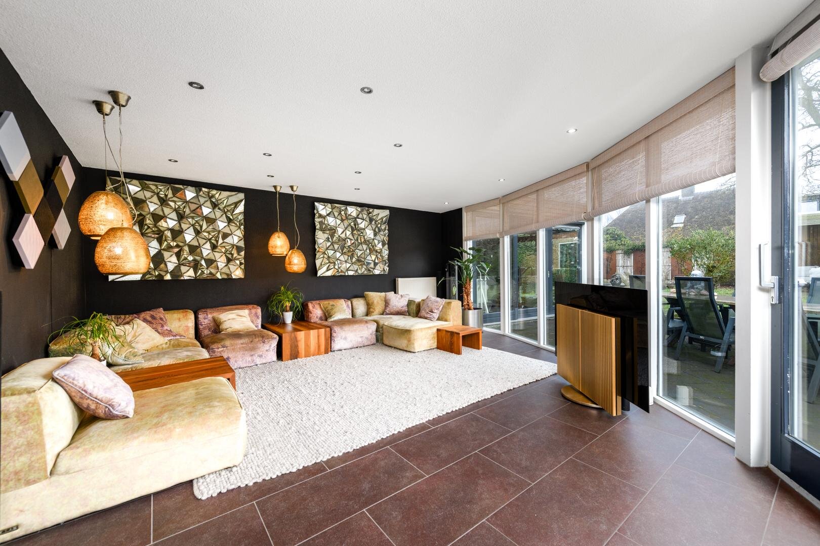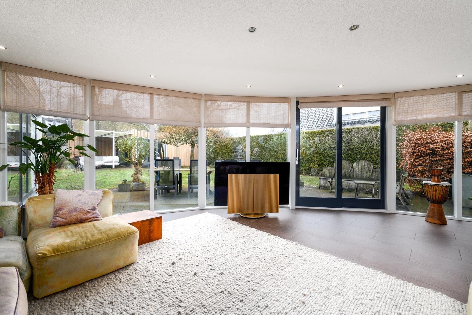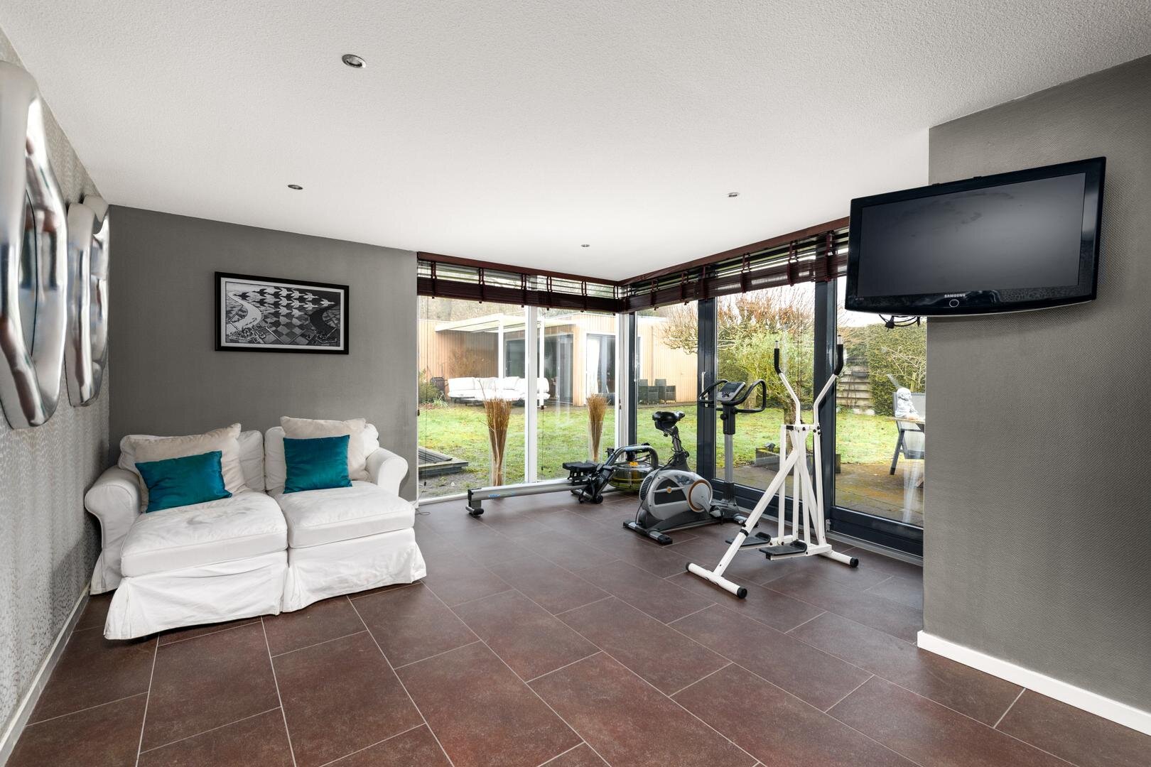 De living is in een U-vorm en met een rookkanaal en design haard. De eethoek heeft alle ruimte centraal in het huis en grenst aan de luxe keuken met inbouwapparatuur en Quooker. In de aanbouw van 2008 is een grote tuinkamer gerealiseerd met zicht op de tuin en met een grote schuifdeur naar het terras. Dit is de ultieme plek om aan het eind even de dag neer te strijken en weg van alles te zijn.
