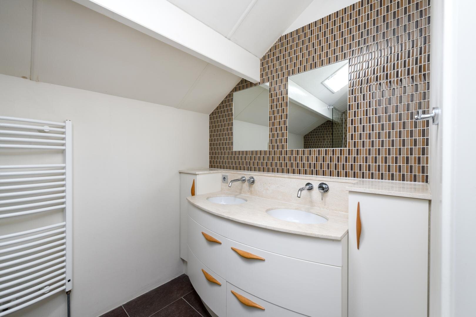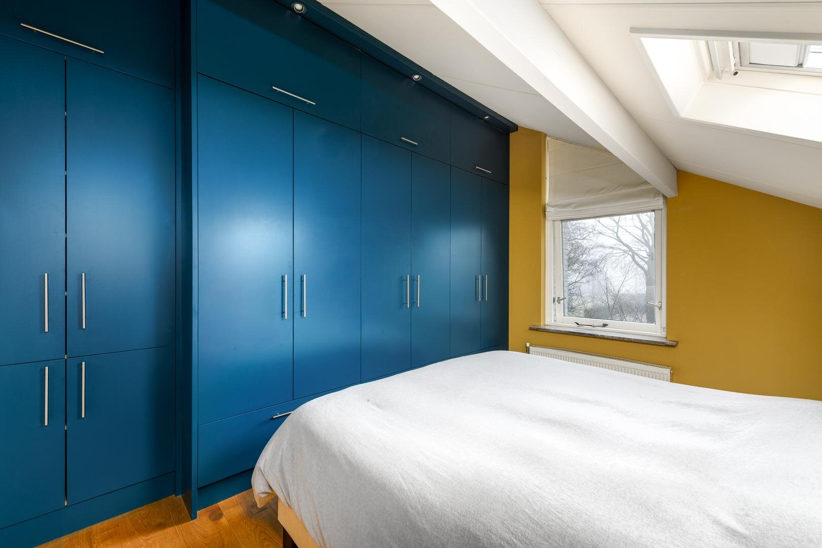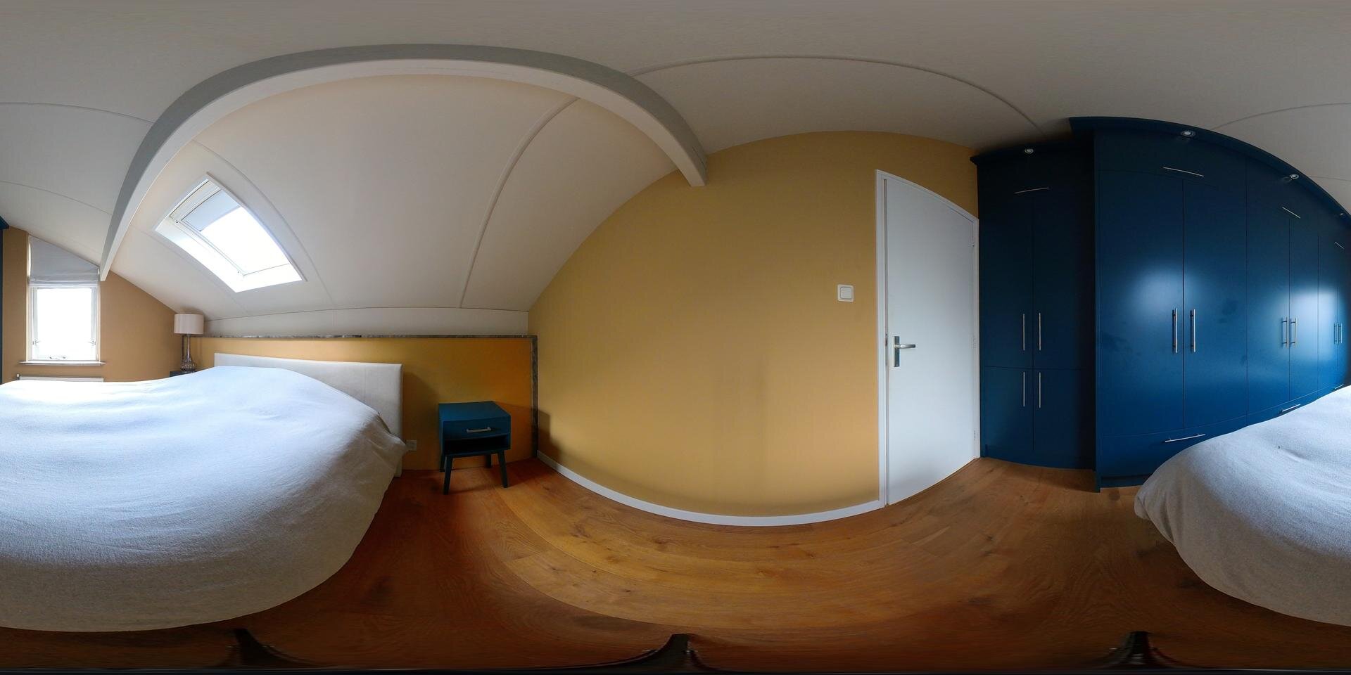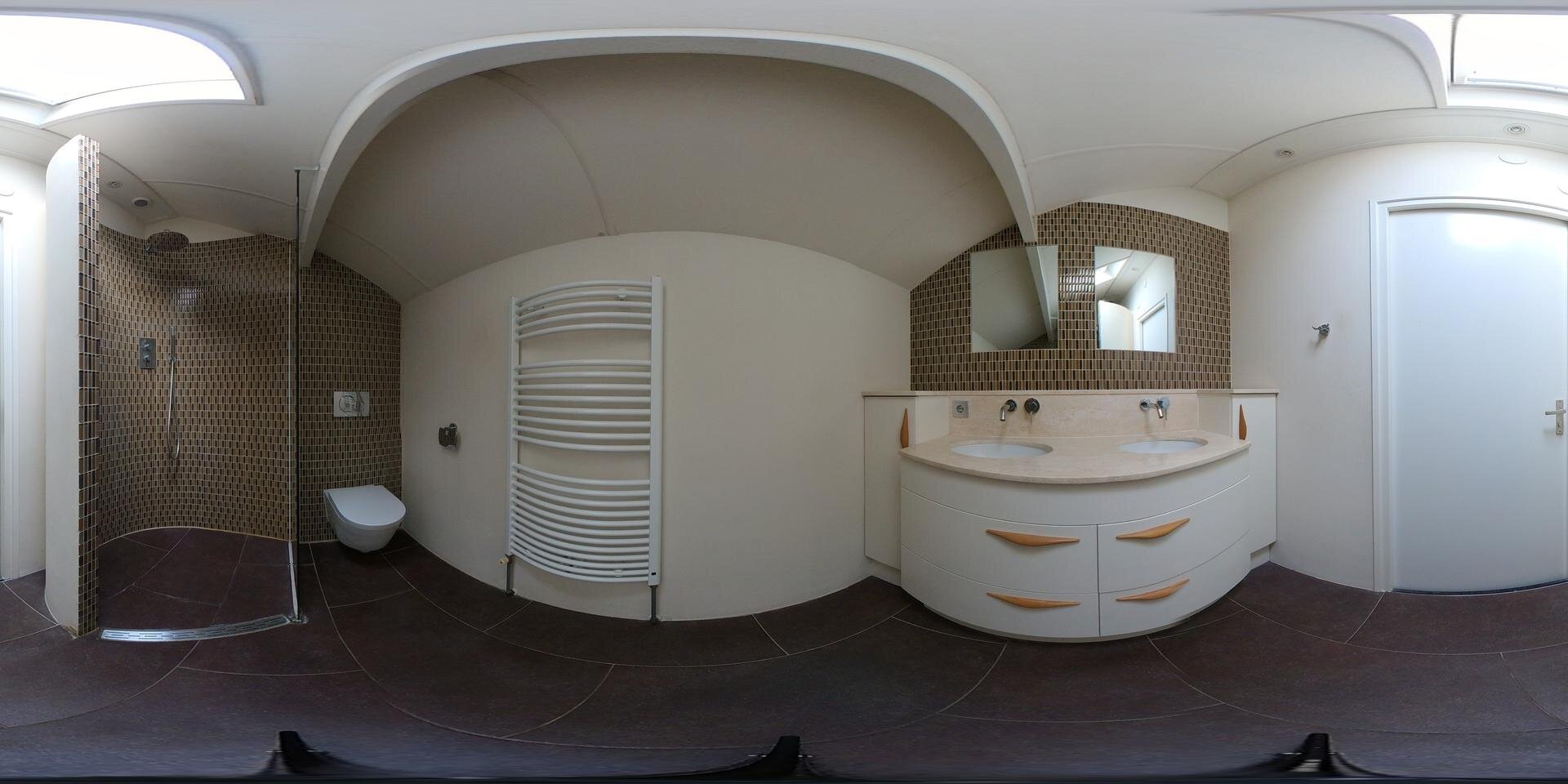 Op de verdieping zijn maar liefst 4 slaapkamers waarvan één met een extra werkkamer aangrenzend. De master bedroom heeft een ingebouwde kastenwand. De plafonds zijn hier hoog met veel zicht en lucht in de kap, waardoor het allemaal extra ruim aanvoelt. De badkamer is met een royale inloopdouche, een toilet en een wastafel meubel.