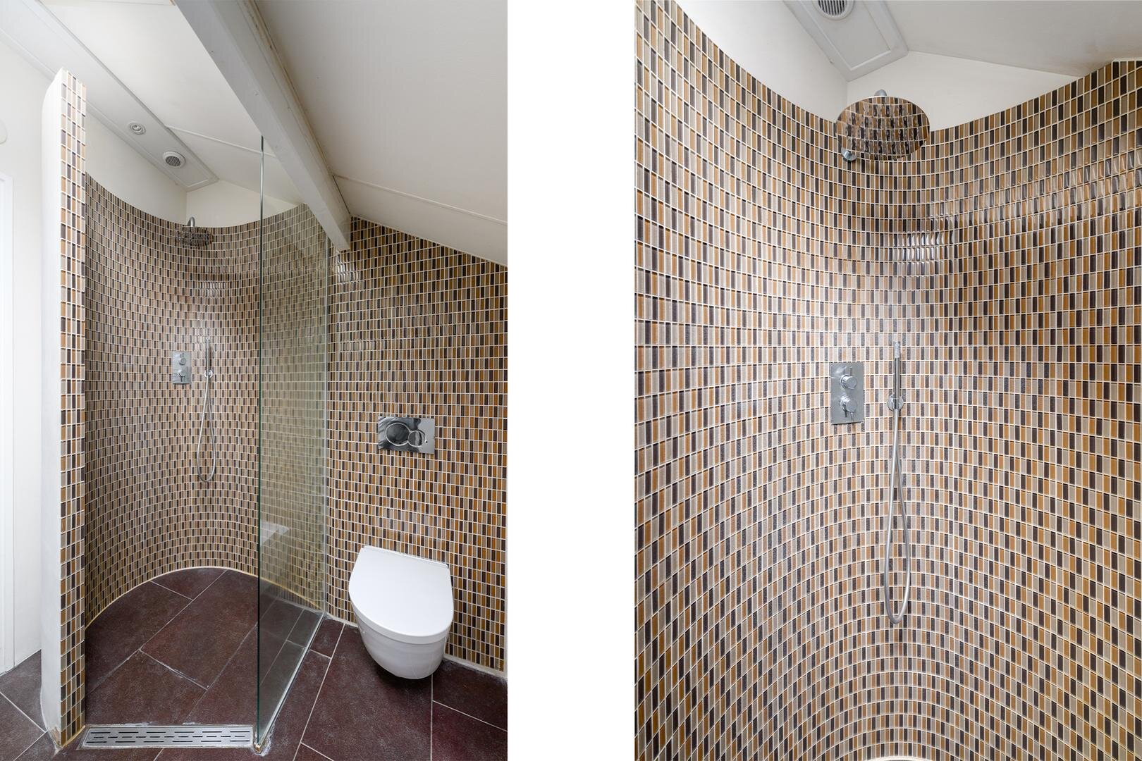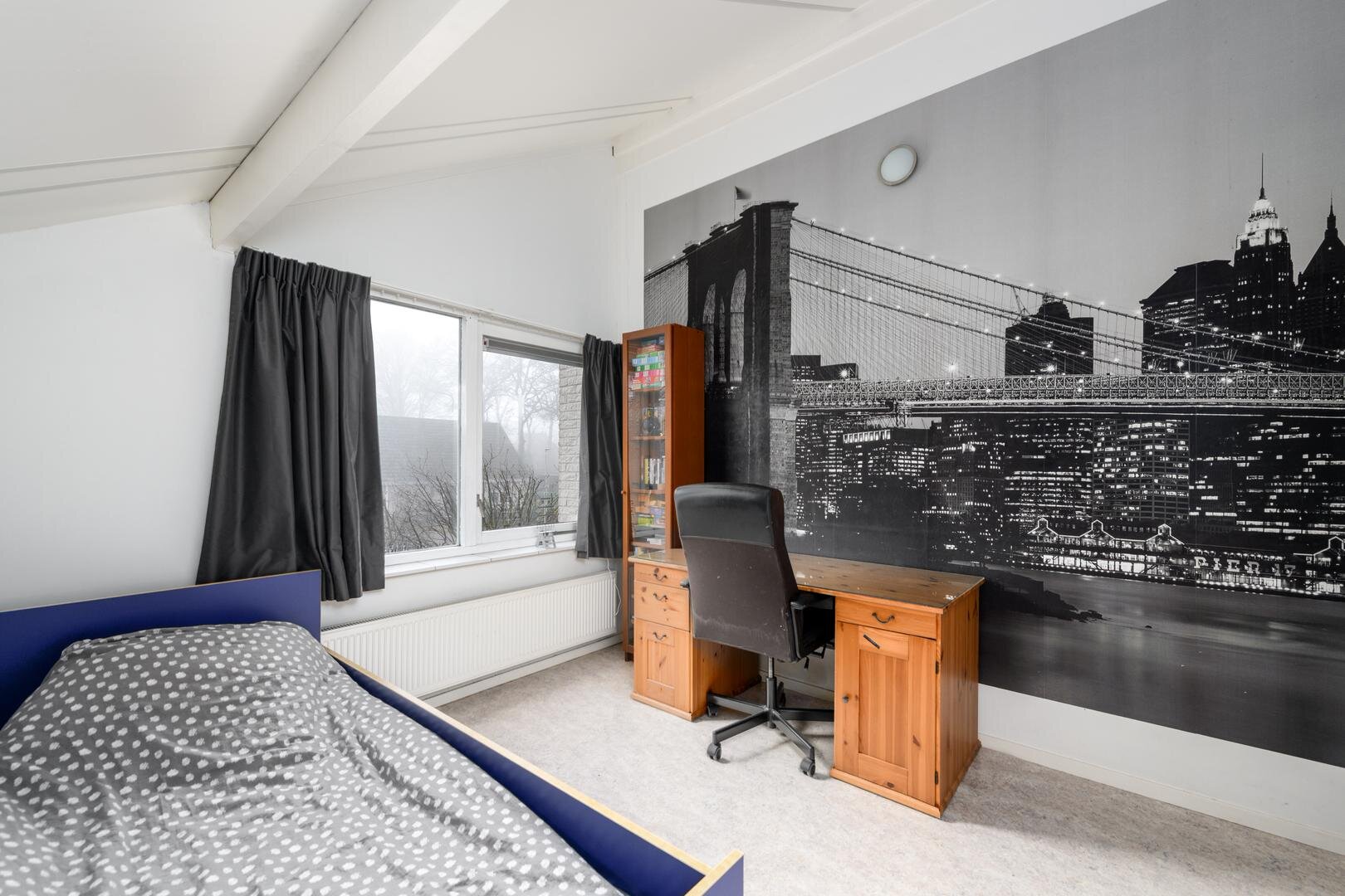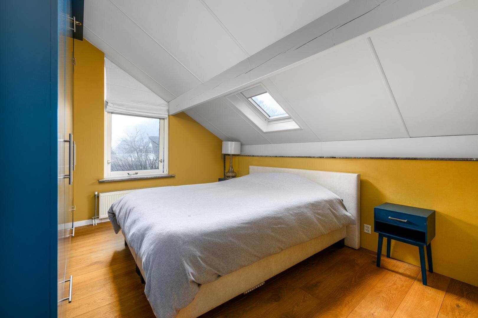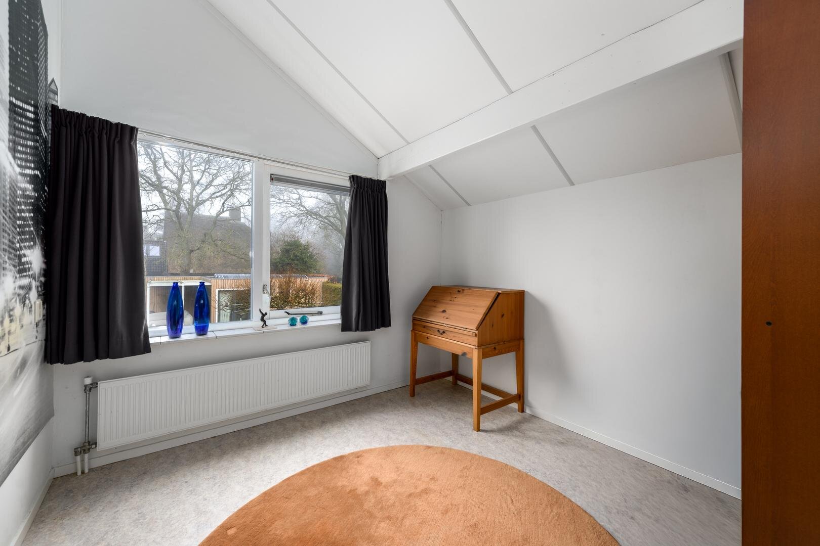 Op de verdieping zijn maar liefst 4 slaapkamers waarvan één met een extra werkkamer aangrenzend. De master bedroom heeft een ingebouwde kastenwand. De plafonds zijn hier hoog met veel zicht en lucht in de kap, waardoor het allemaal extra ruim aanvoelt. De badkamer is met een royale inloopdouche, een toilet en een wastafel meubel.