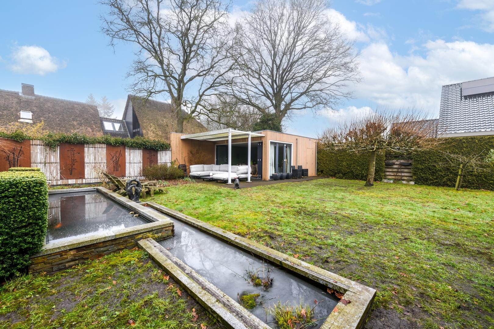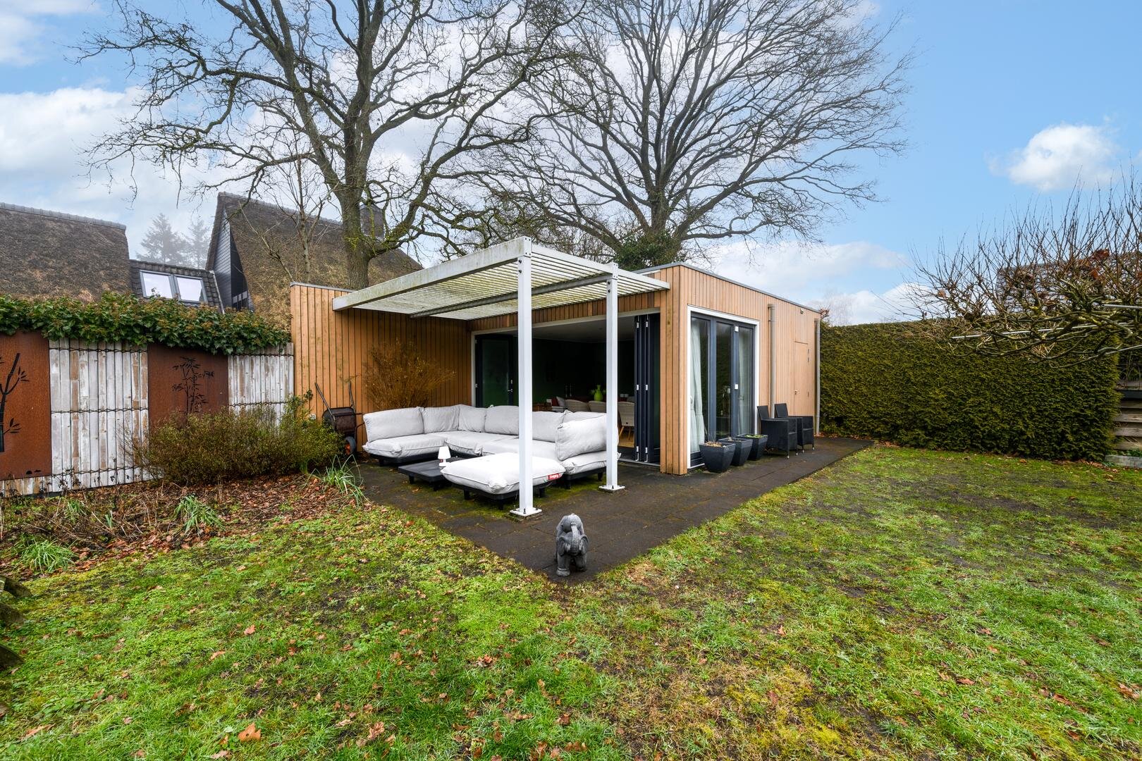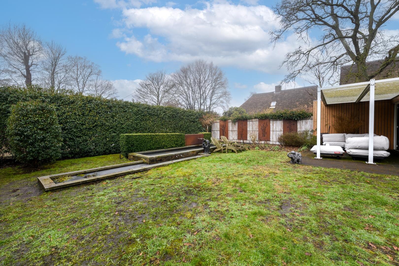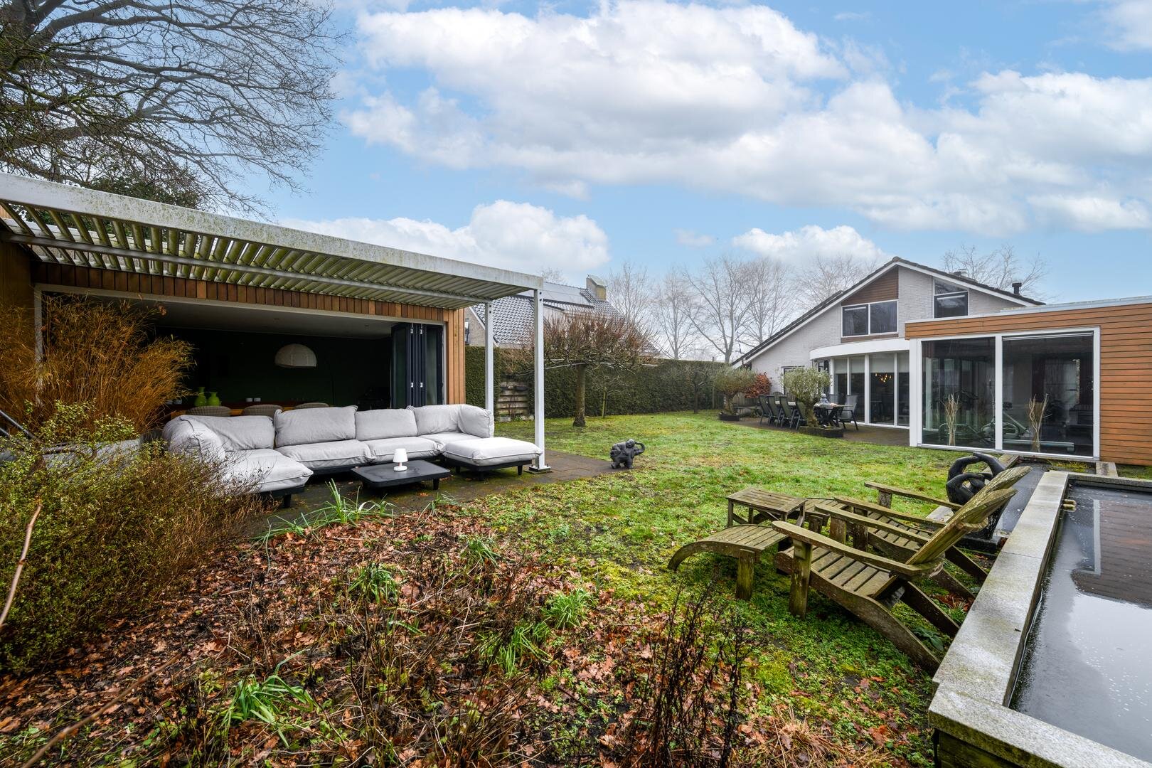 De royale tuinkamer, gebouwd in 2008, geïsoleerd en met een glazen vouwwand die helemaal open kan. De tuin is ruim, besloten en met veel privacy en zon rondom. Met terrassen en een fraaie vijverpartij.