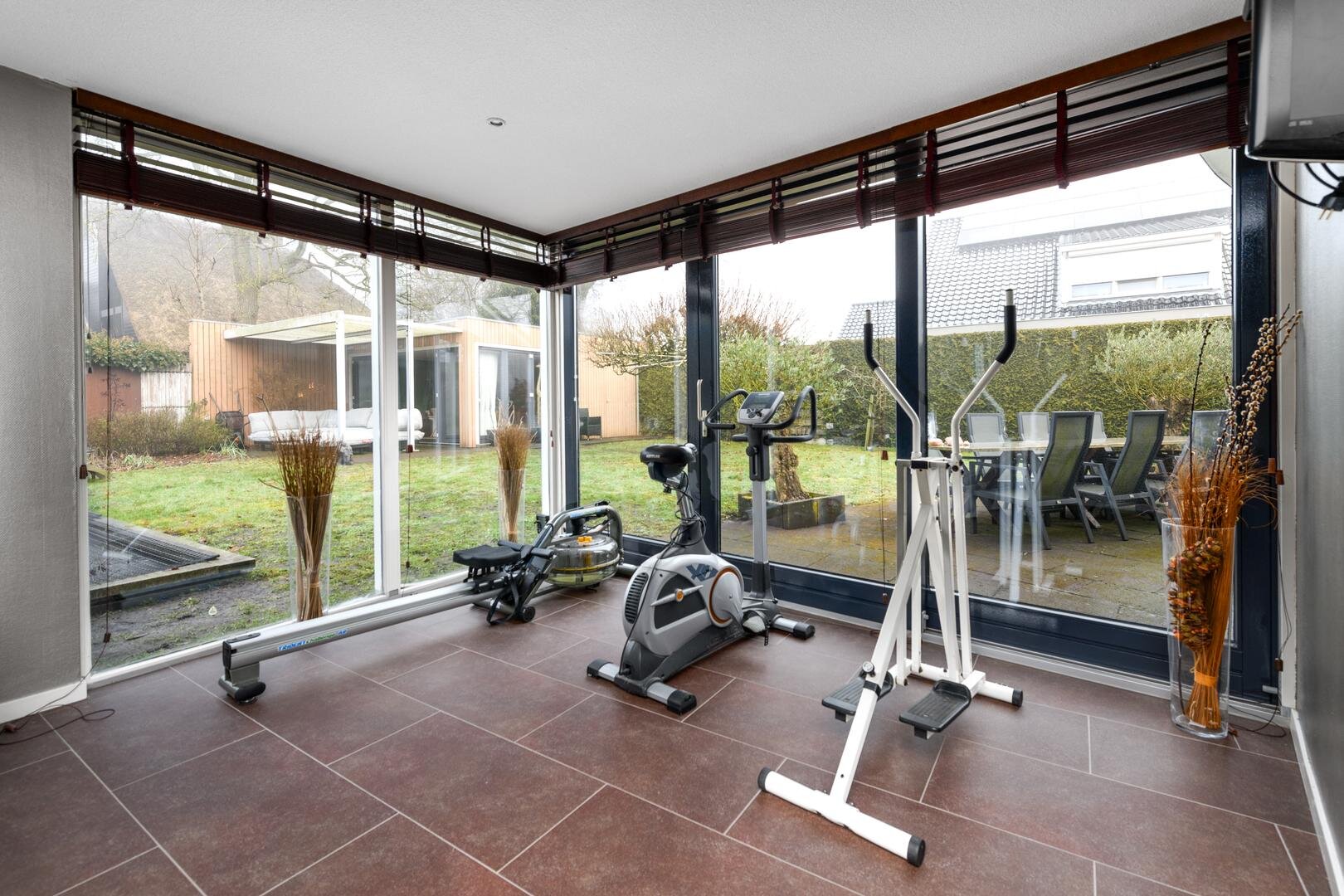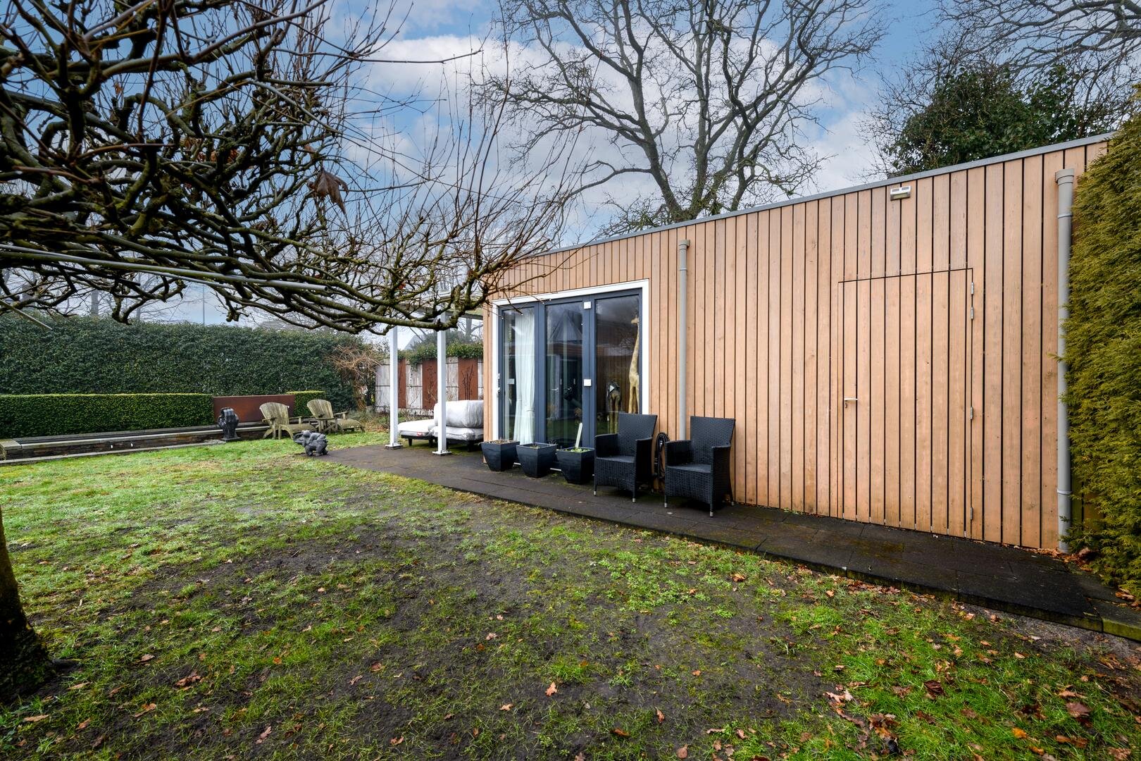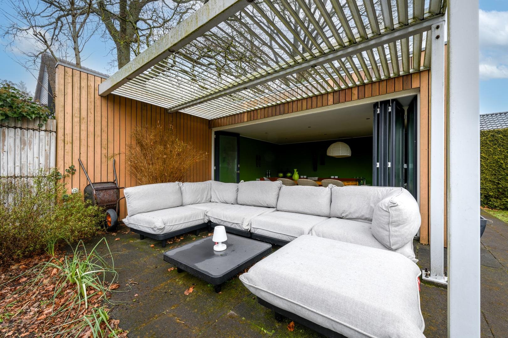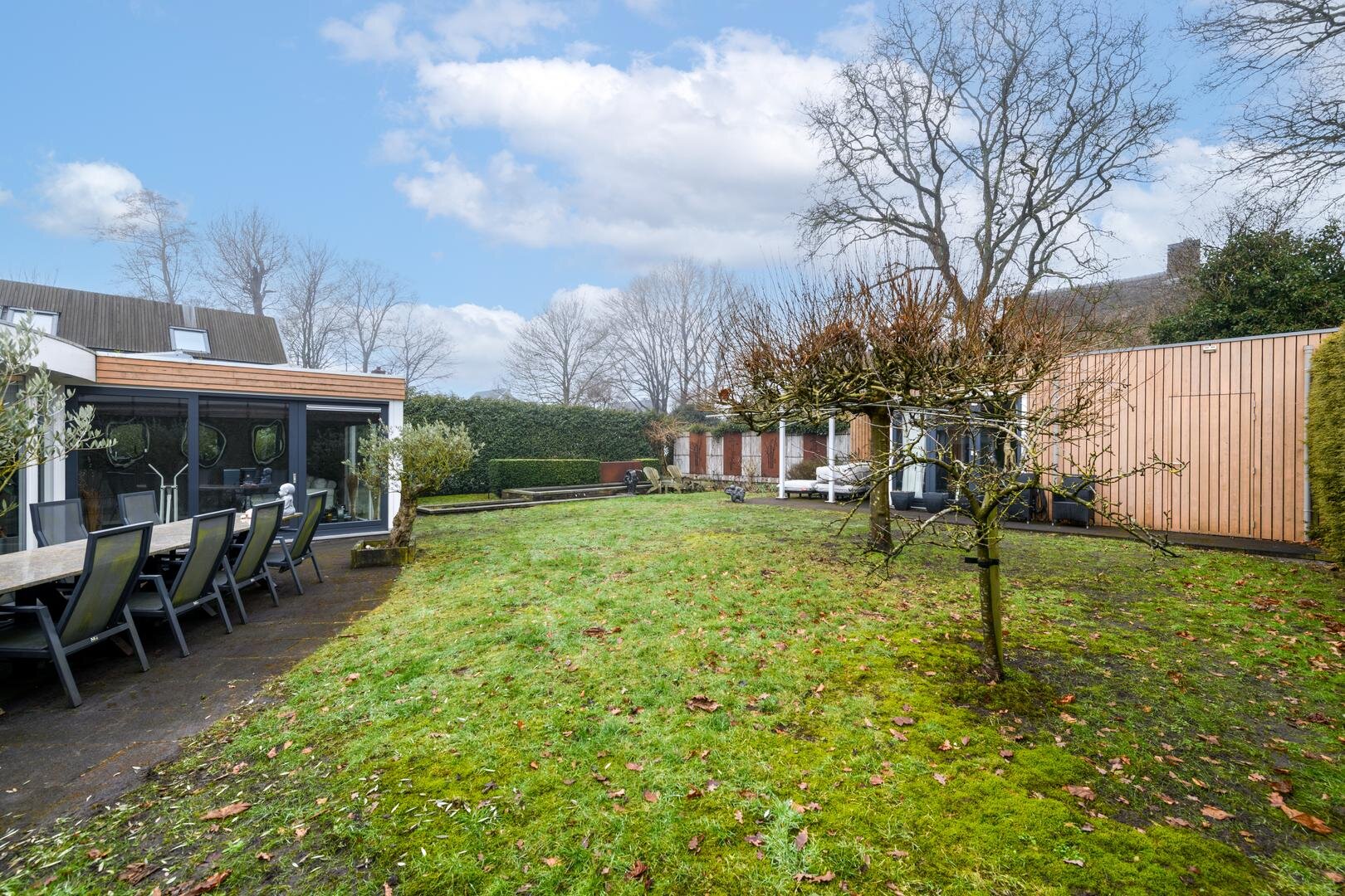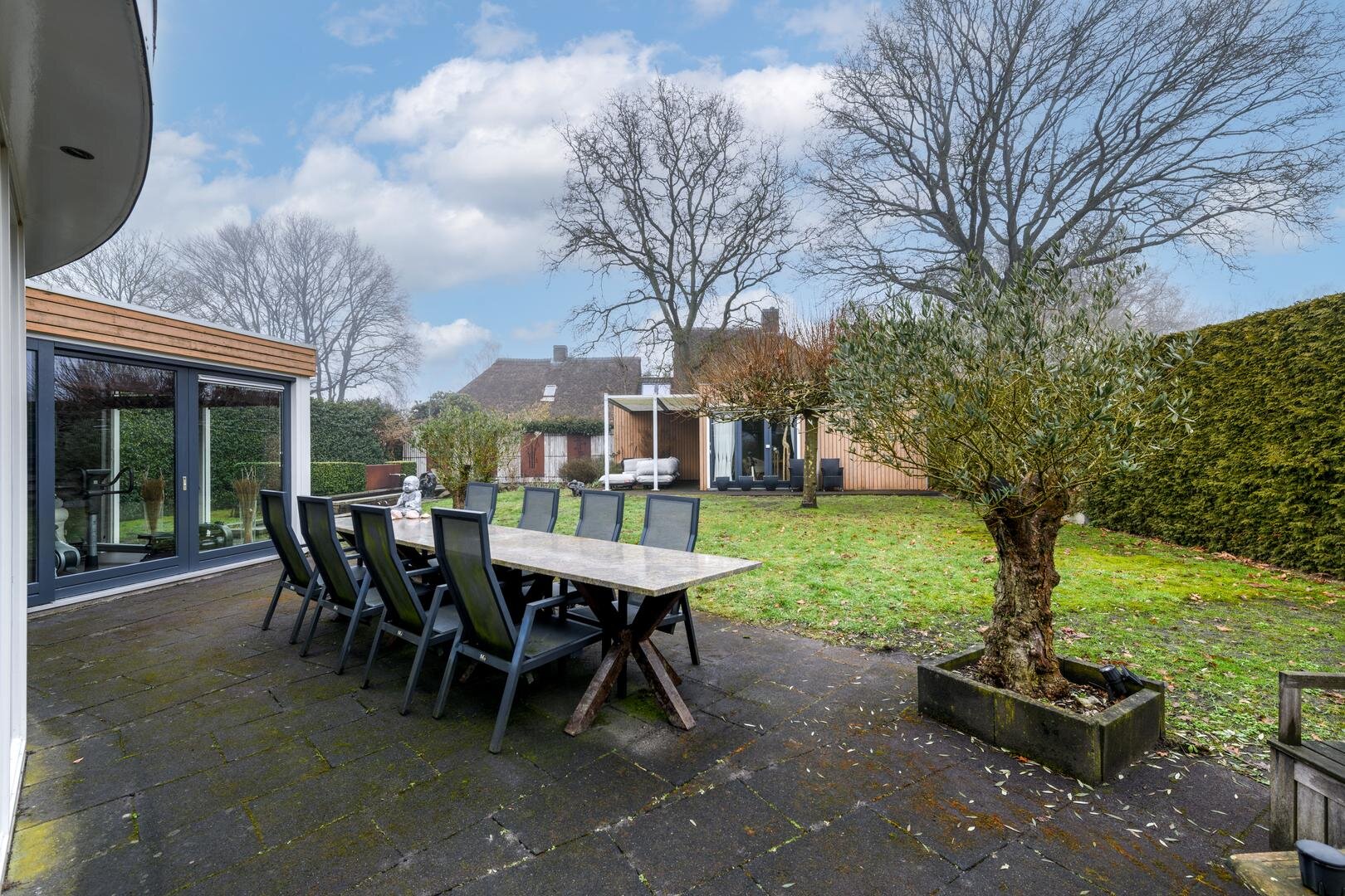 De royale tuinkamer, gebouwd in 2008, geïsoleerd en met een glazen vouwwand die helemaal open kan. De tuin is ruim, besloten en met veel privacy en zon rondom. Met terrassen en een fraaie vijverpartij.