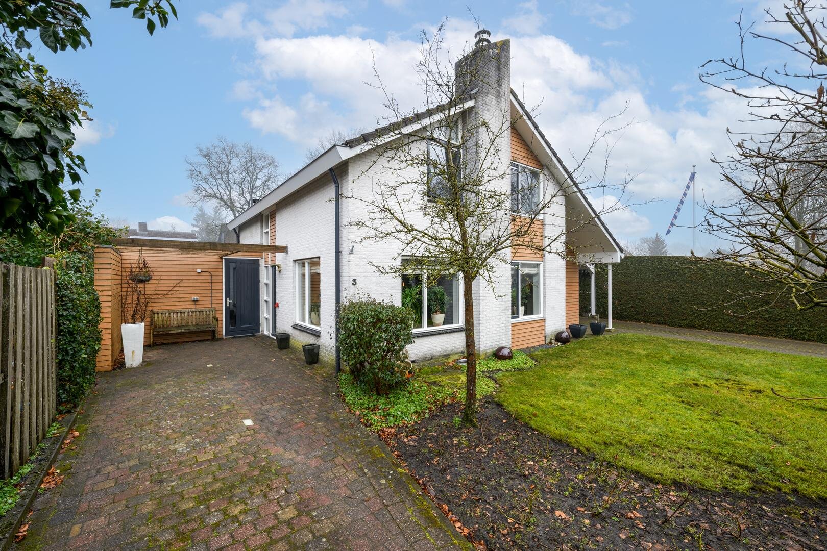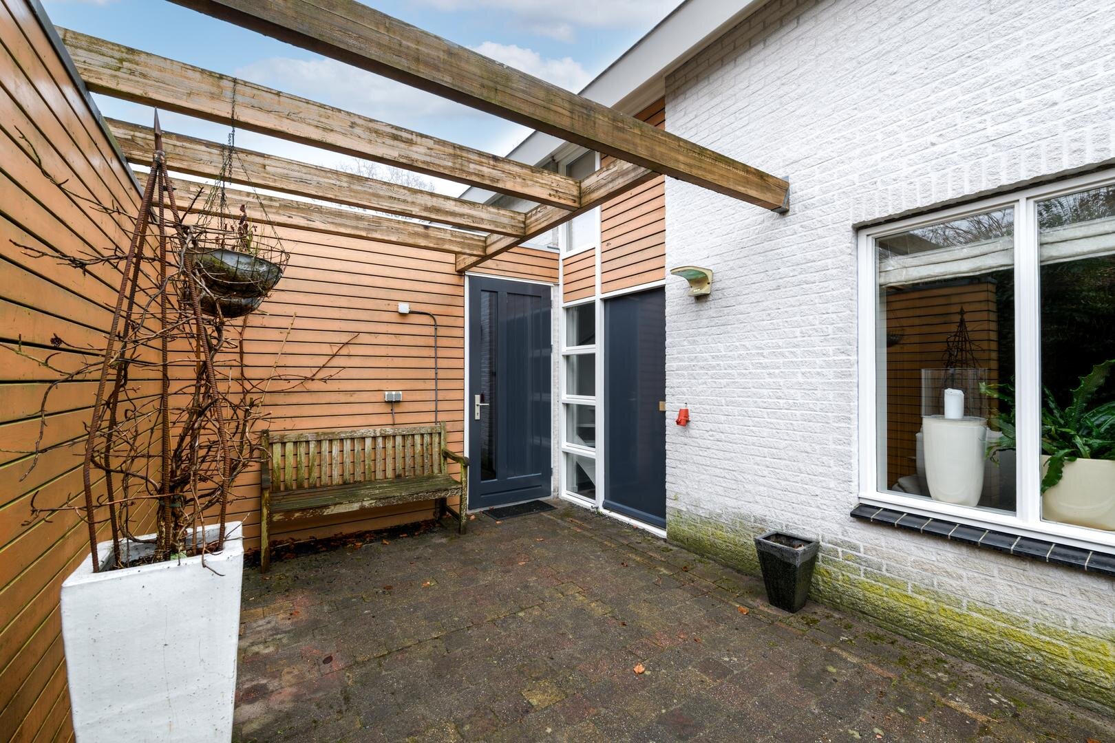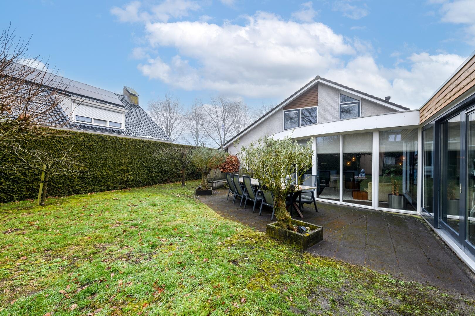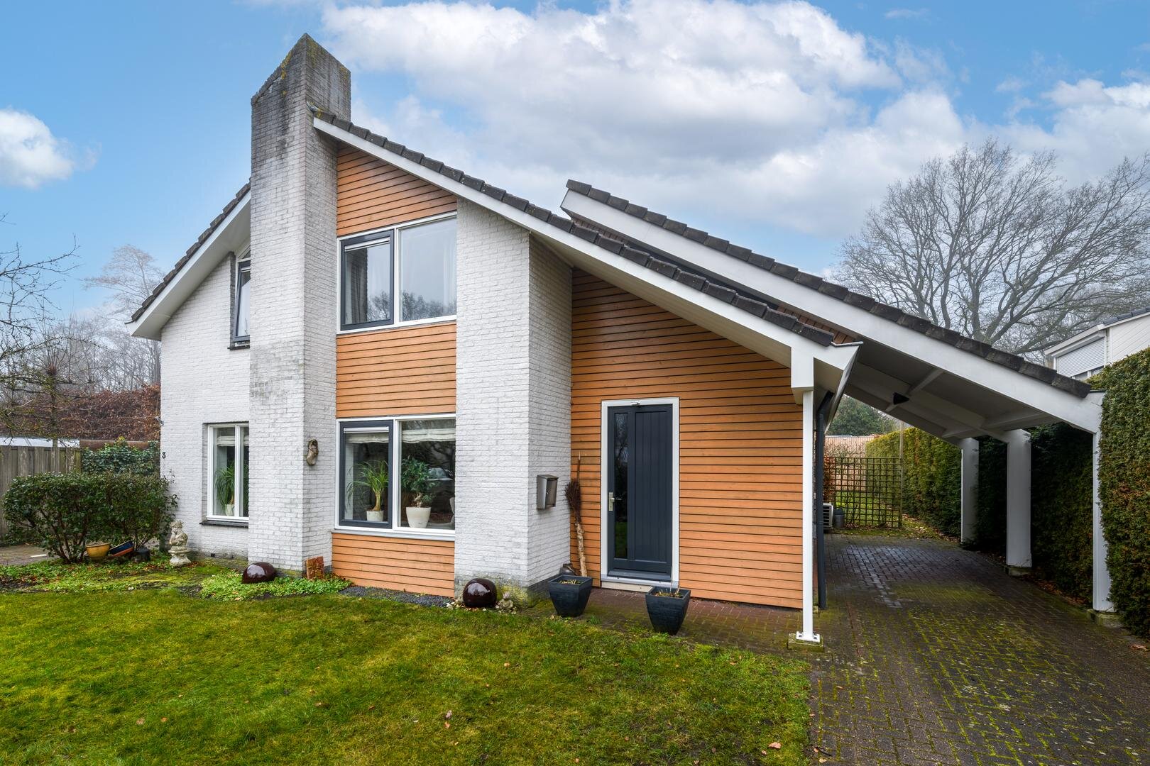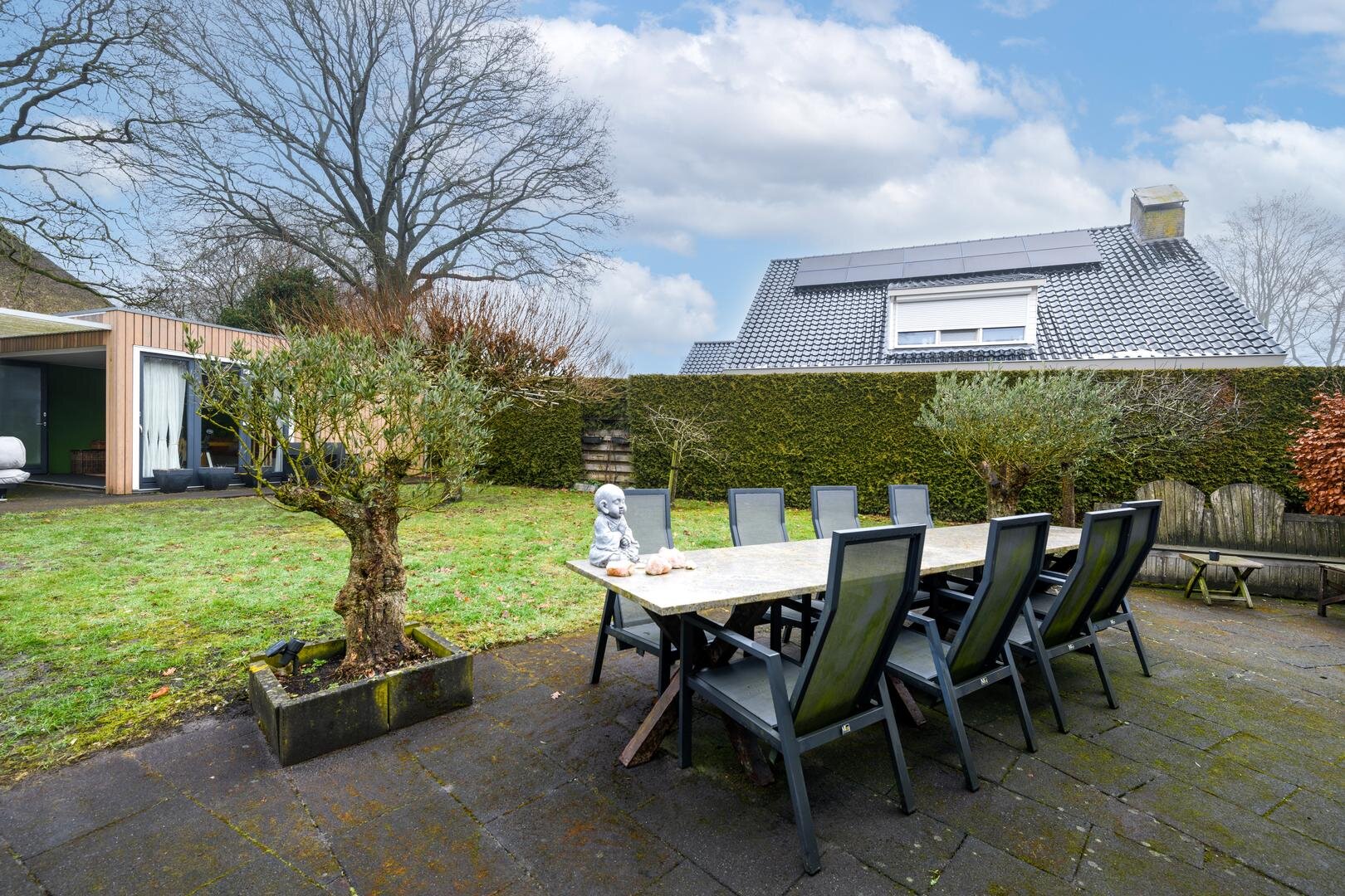 Buiten kun je helemaal om het huis heen komen. Er is een ruime carport en er is een laadpaal voor de elektrische auto.