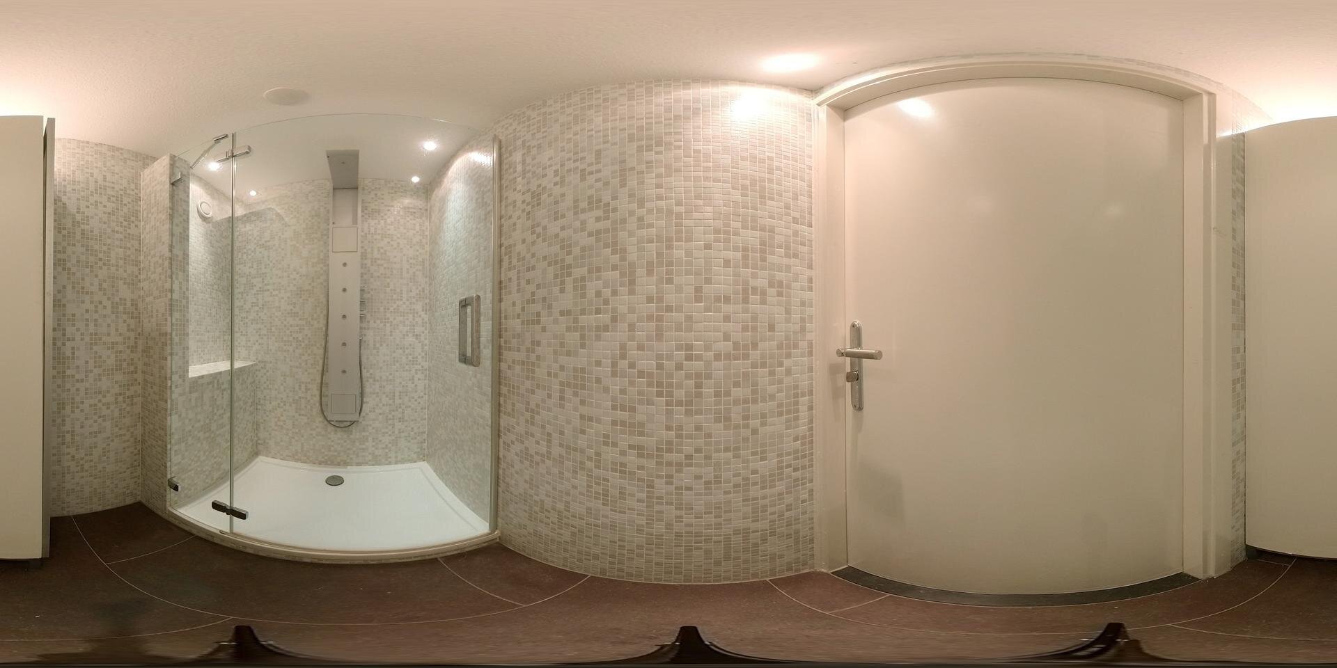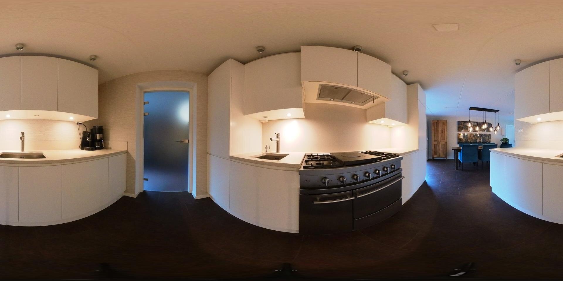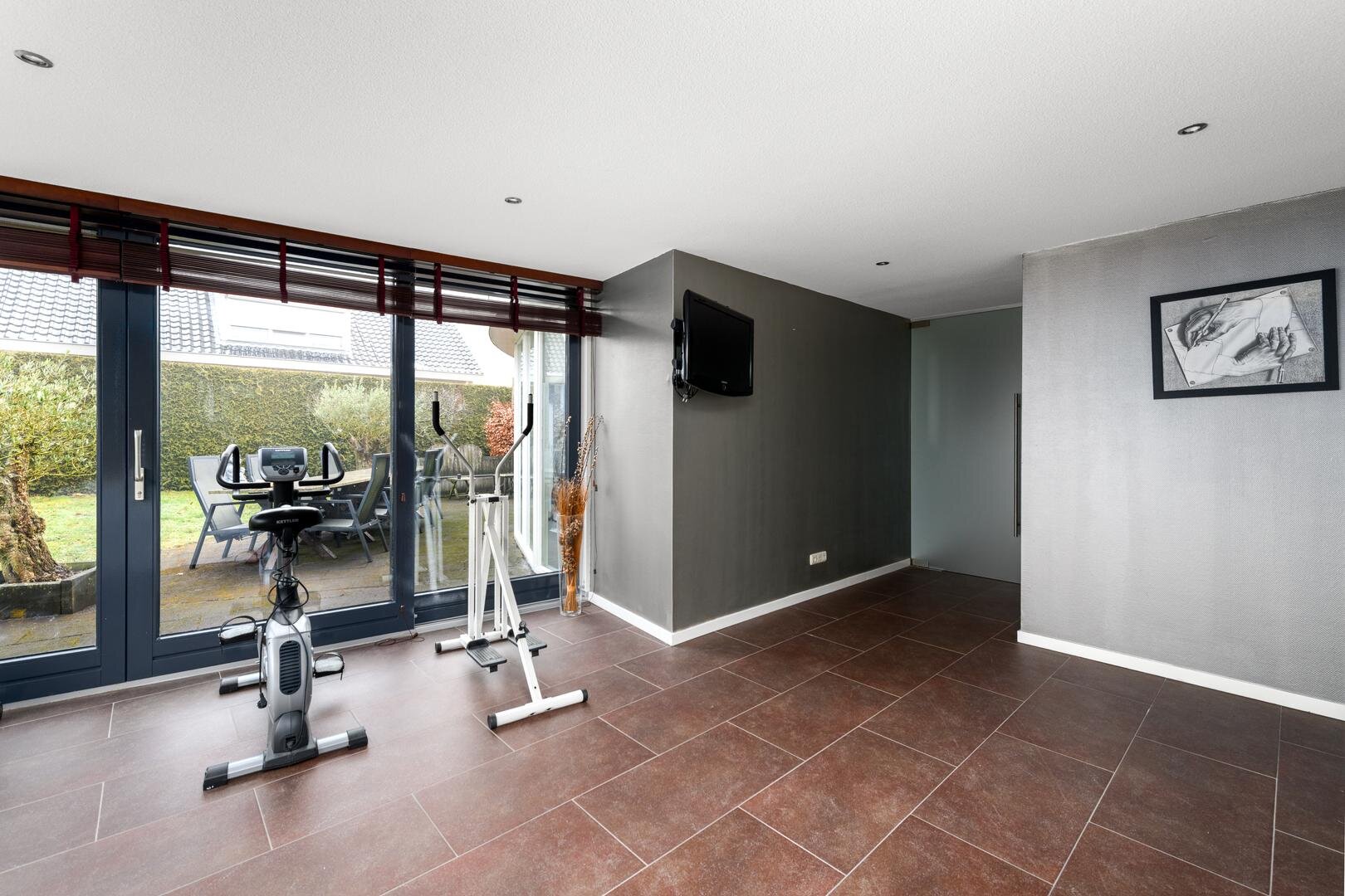 Via de keuken komen we in een ruime bijkeuken (met een deur naar de oprit) en een doorloop naar een aangebouwde werkkamer/slaapkamer met een doucheruimte en ook met een schuifpui naar het terras. De vloeren zijn overal met vloerverwarming behoudens de wijnbar.