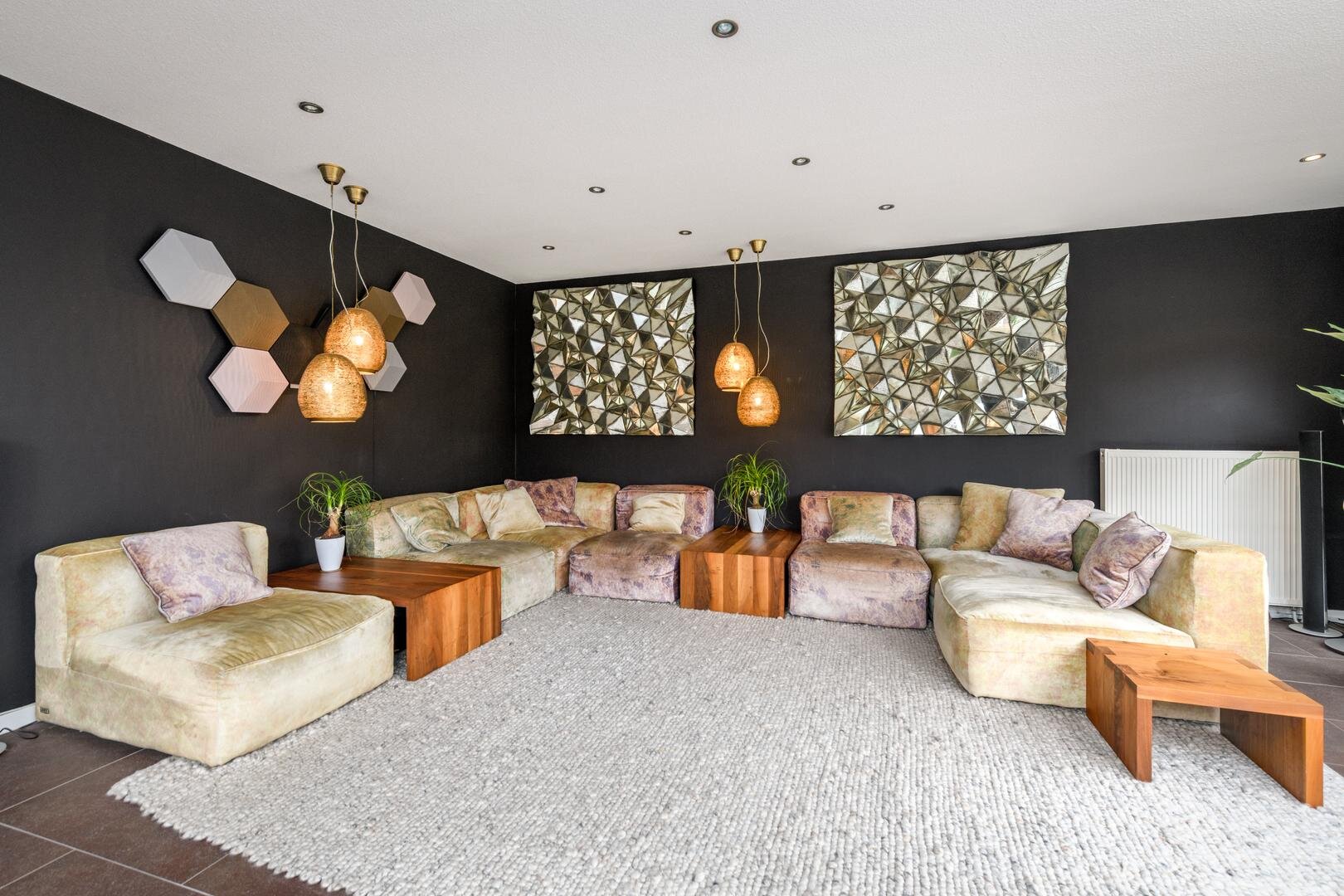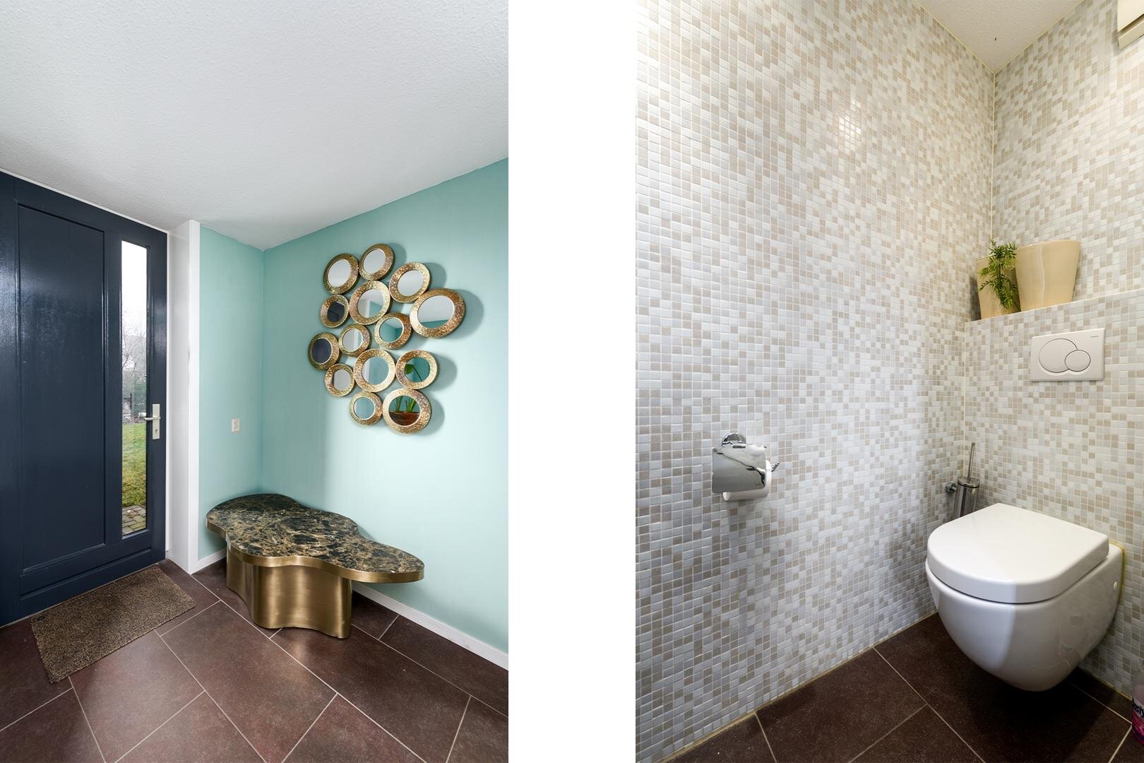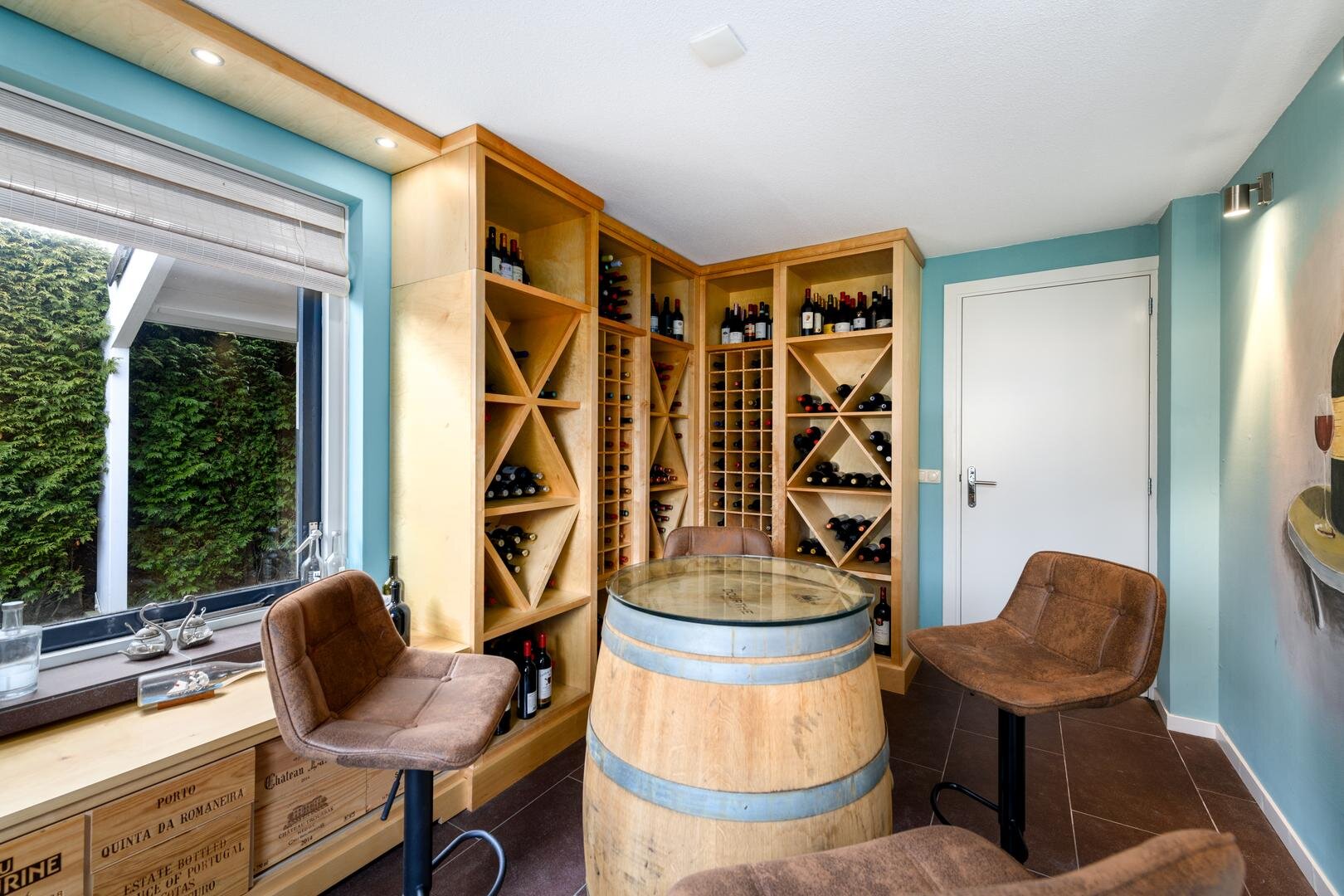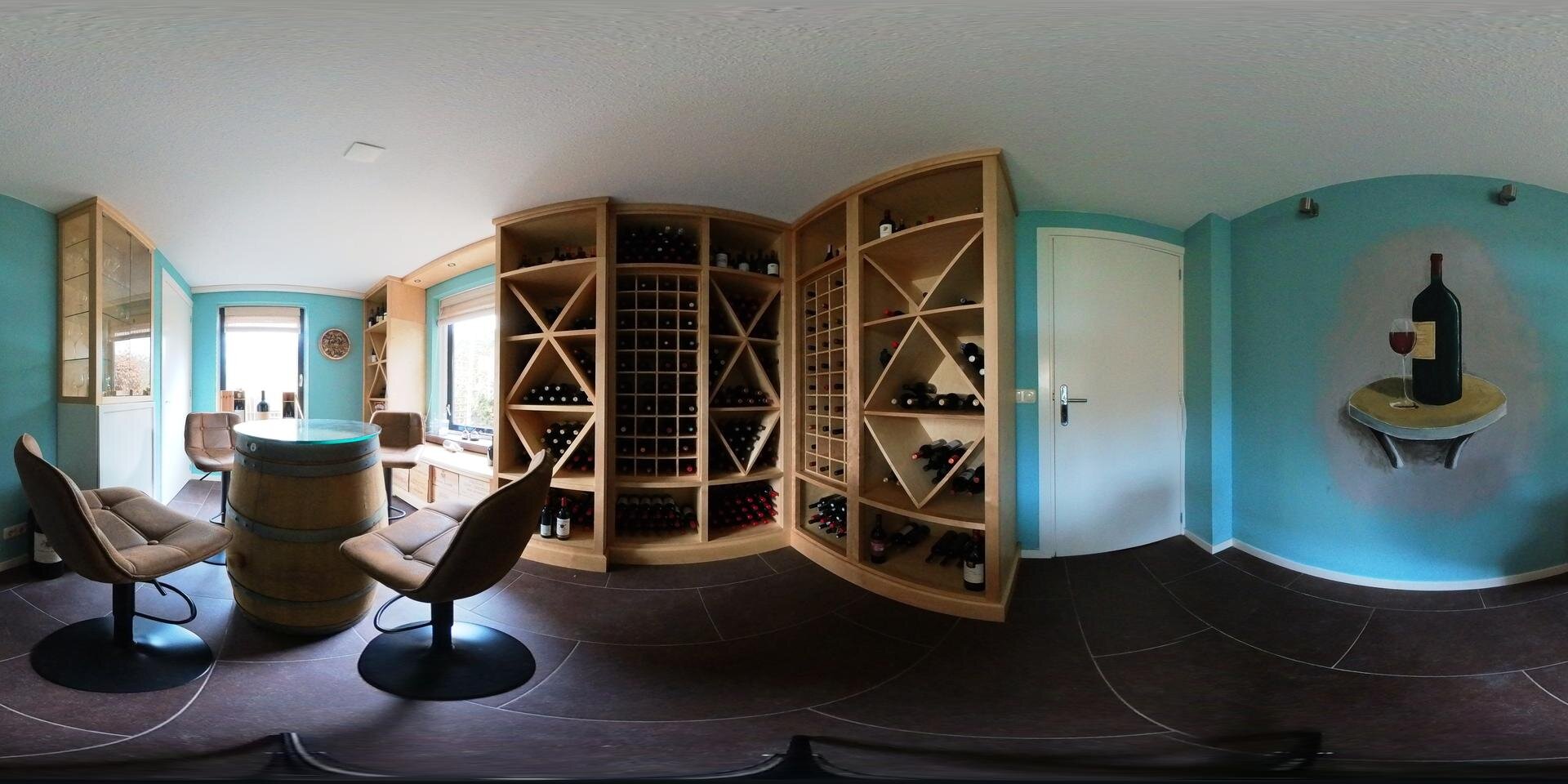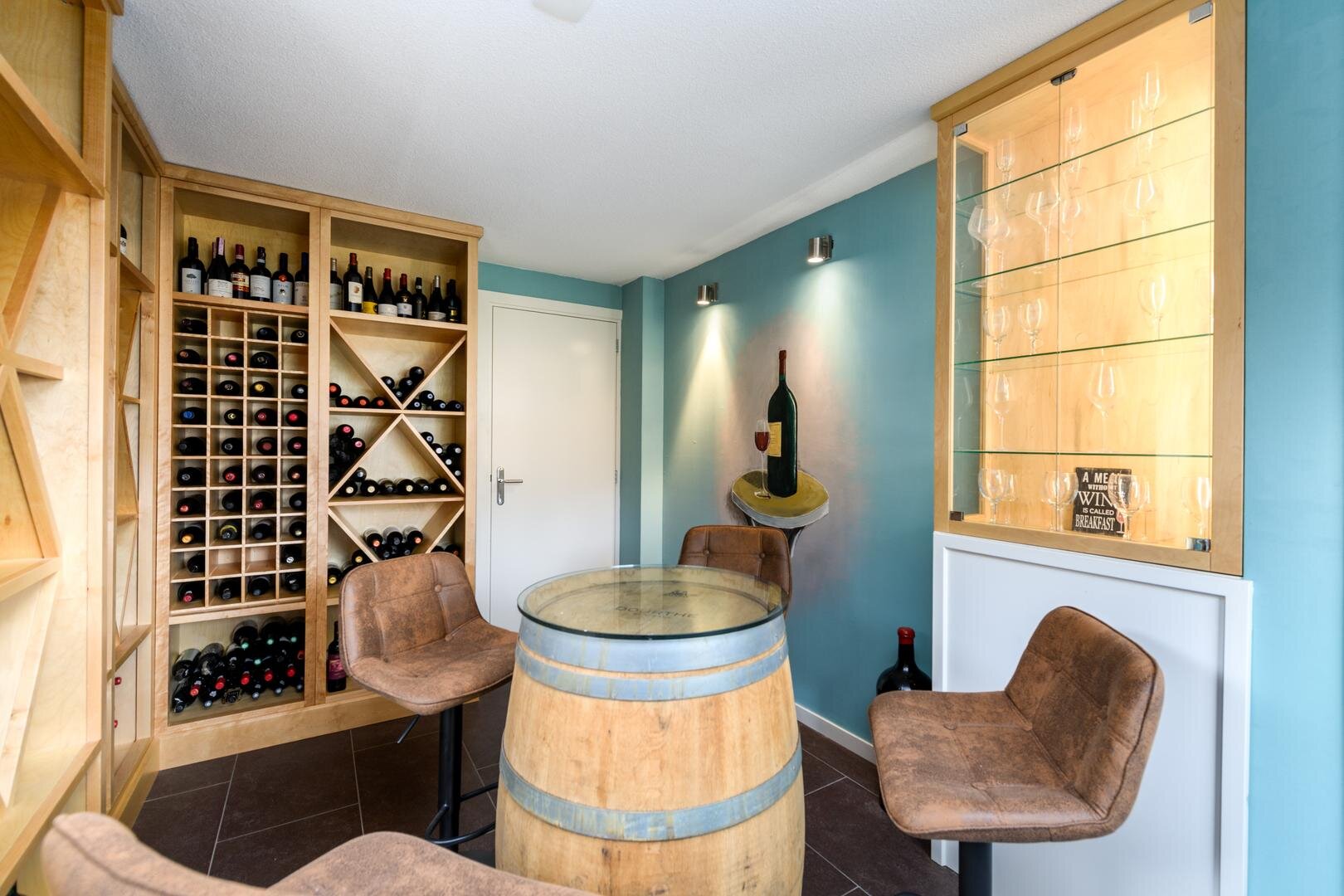 Aan de andere kant van de living, op de rechter flank van het huis vinden we een tweede separate entree. Je stapt hier binnen in een ruime entree/hal met garderobe en een gastentoilet met fontein. Daarachter een werkkamer die nu in gebruik is als wijnbar. Deze omgeving is ook geschikt voor werken aan huis met een eigen entree.