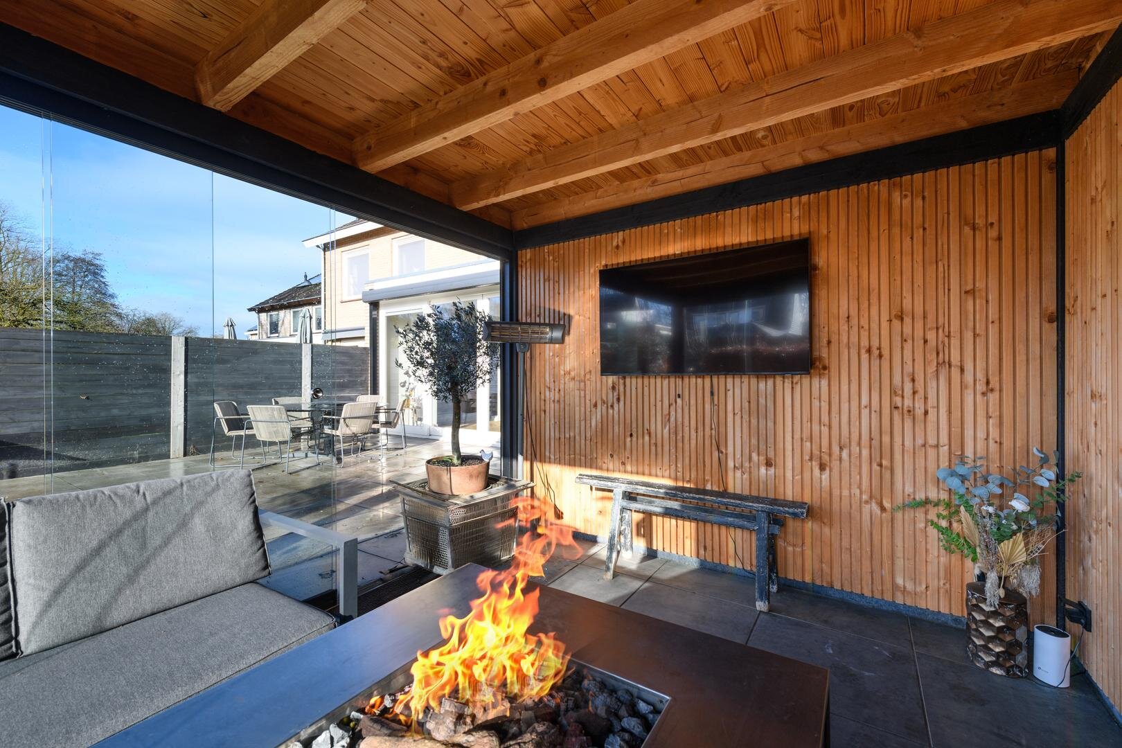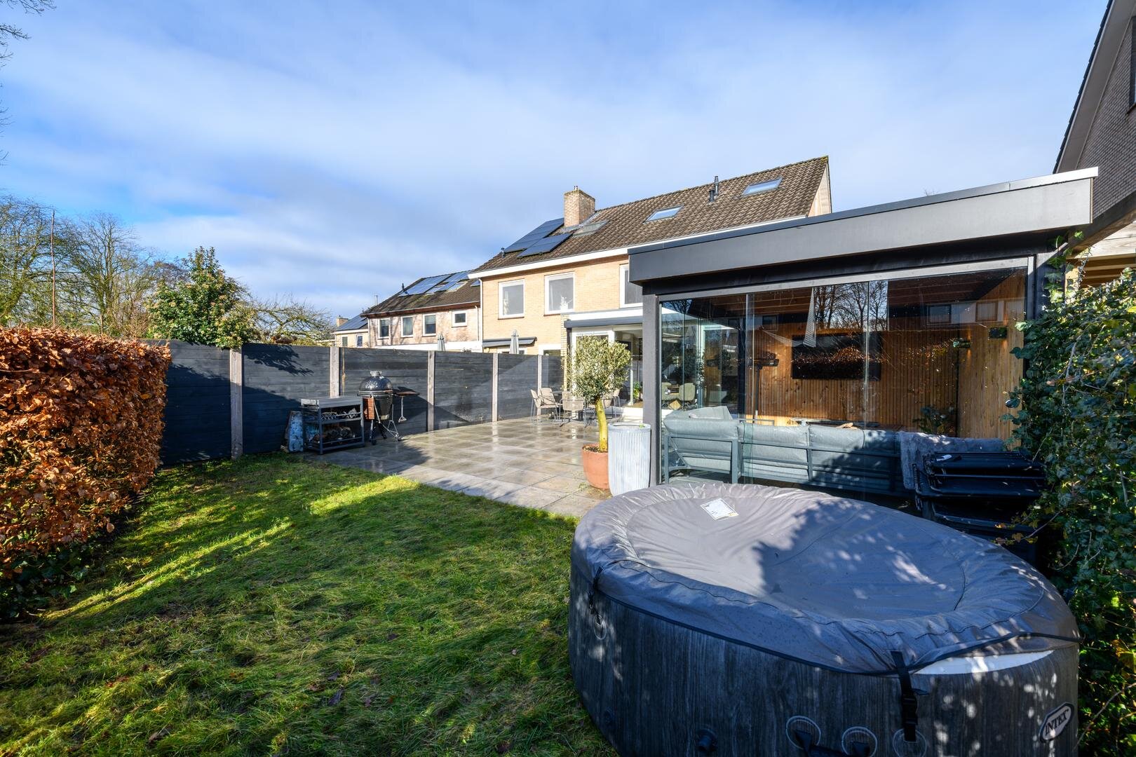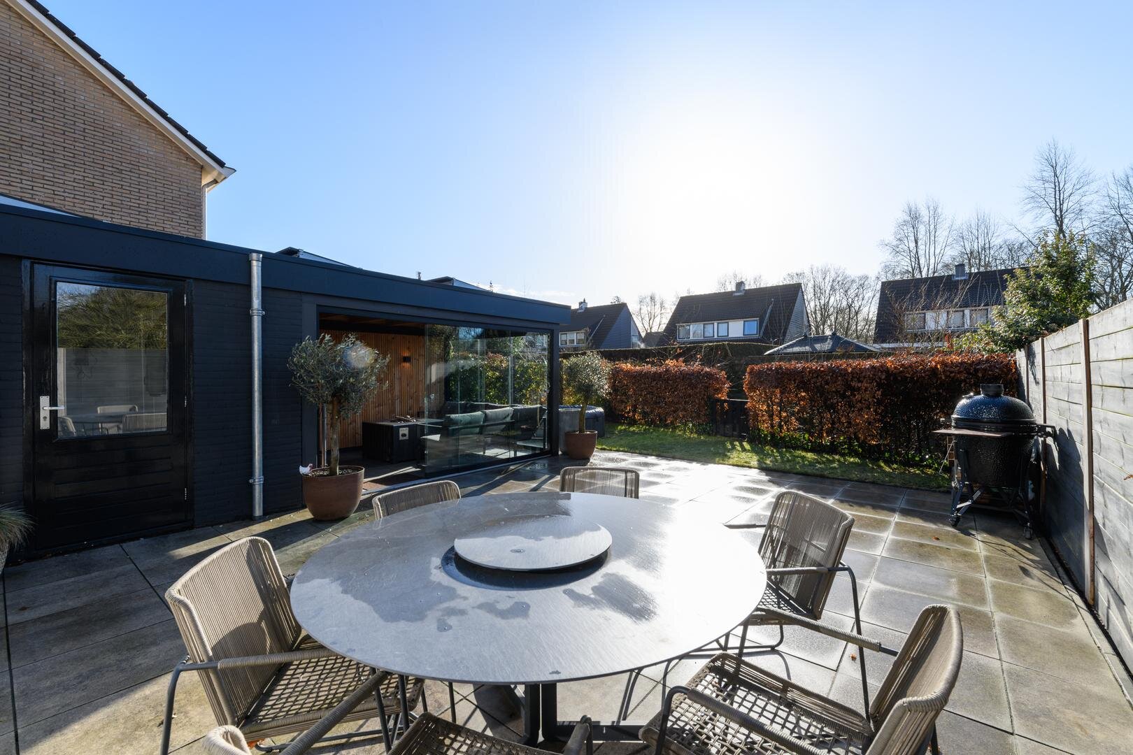 En dan nog de tuin, heel besloten, op het zuiden gericht, met veel zon en privacy. Achter de aanbouw is een luxe tuinkamer gebouwd die kan worden afgesloten met een glazen wand. Het is de heerlijke plek voor een zomeravond.