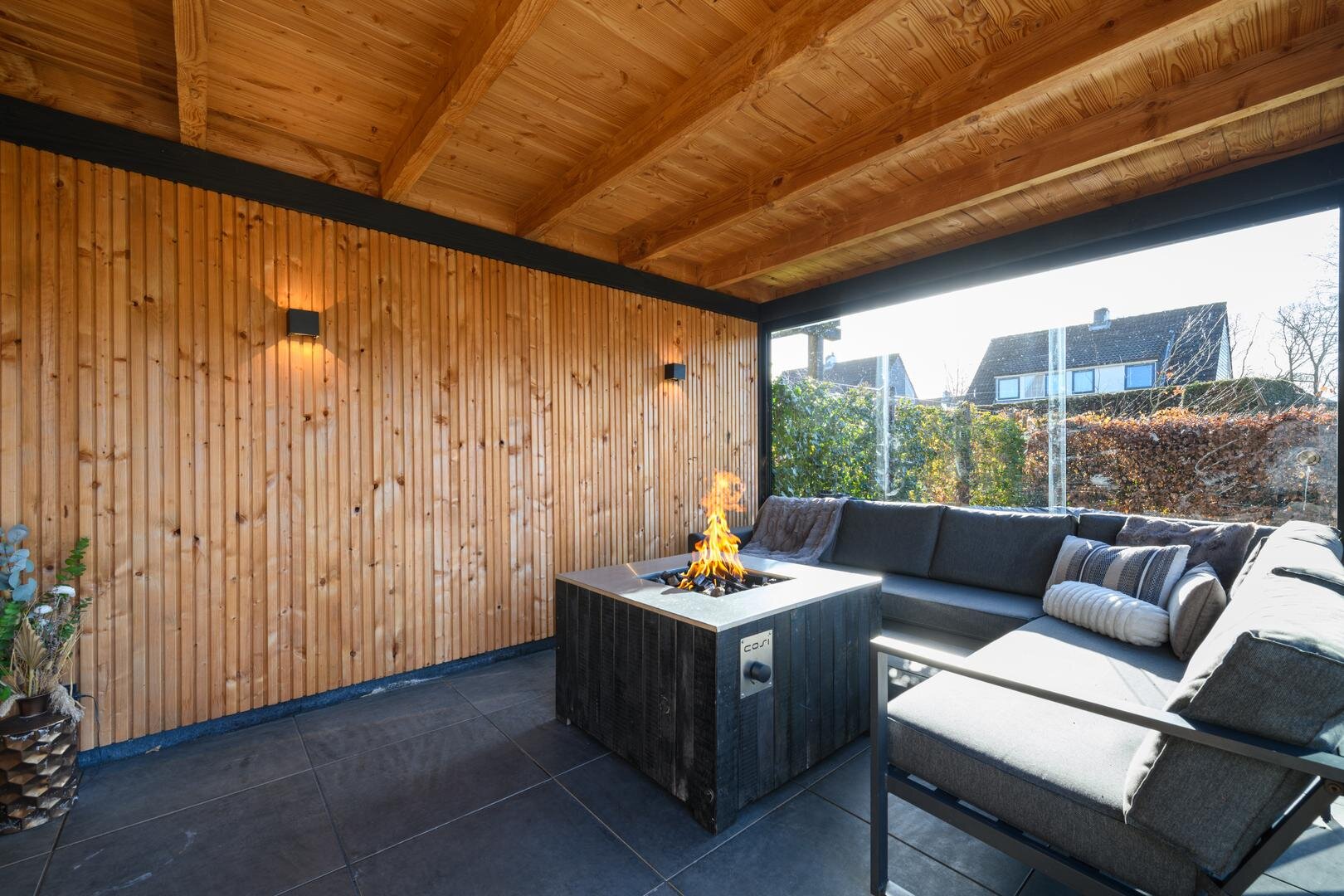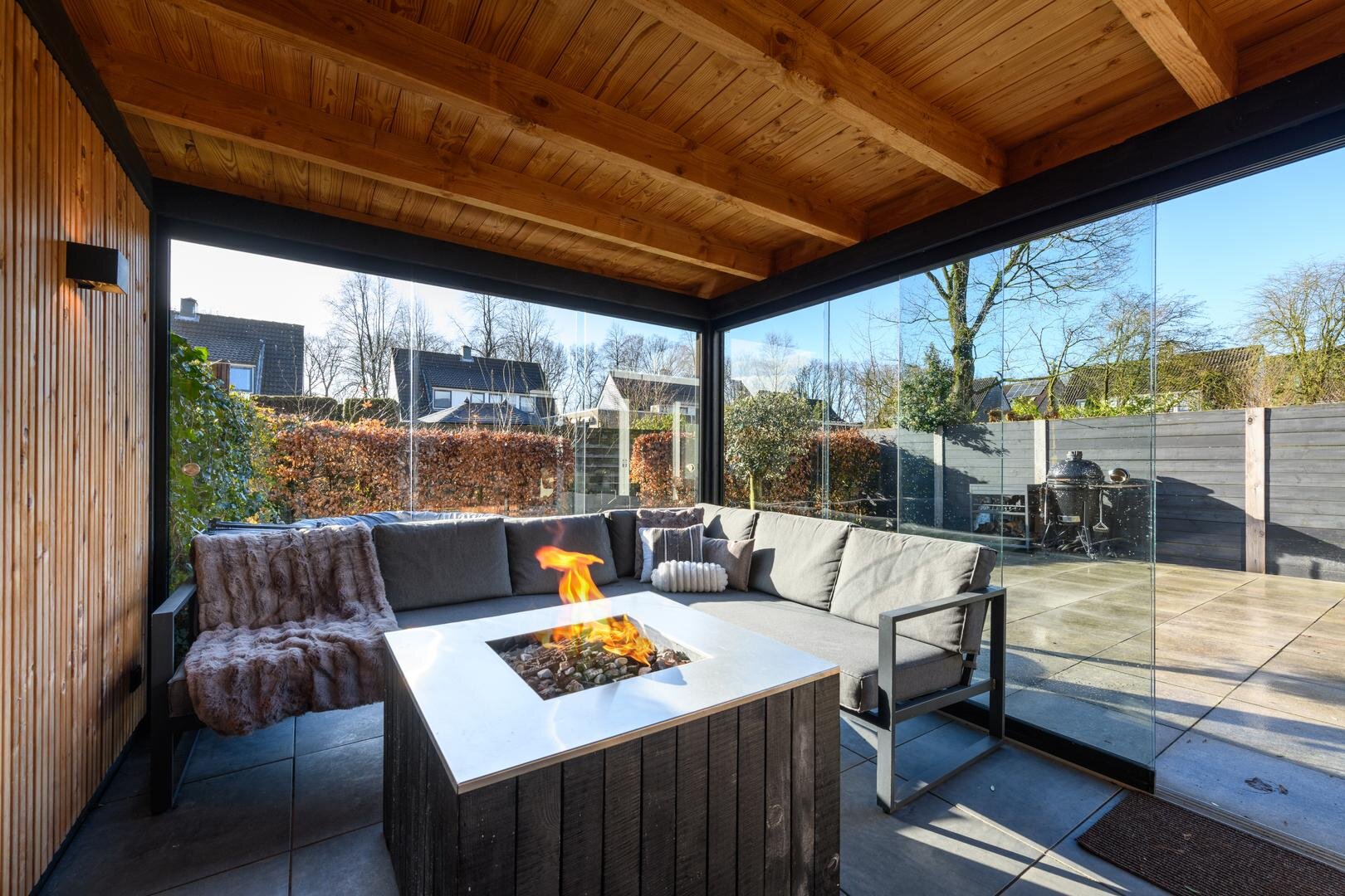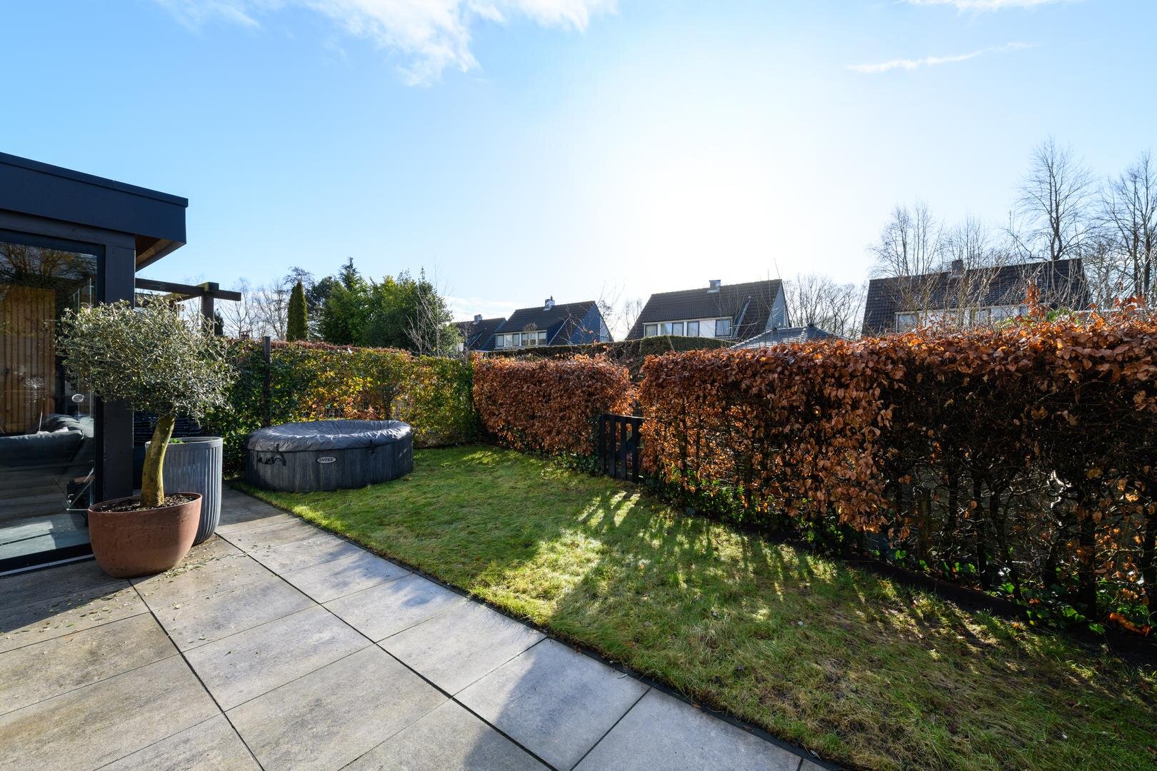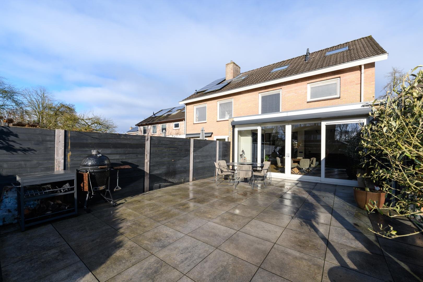 En dan nog de tuin, heel besloten, op het zuiden gericht, met veel zon en privacy. Achter de aanbouw is een luxe tuinkamer gebouwd die kan worden afgesloten met een glazen wand. Het is de heerlijke plek voor een zomeravond.