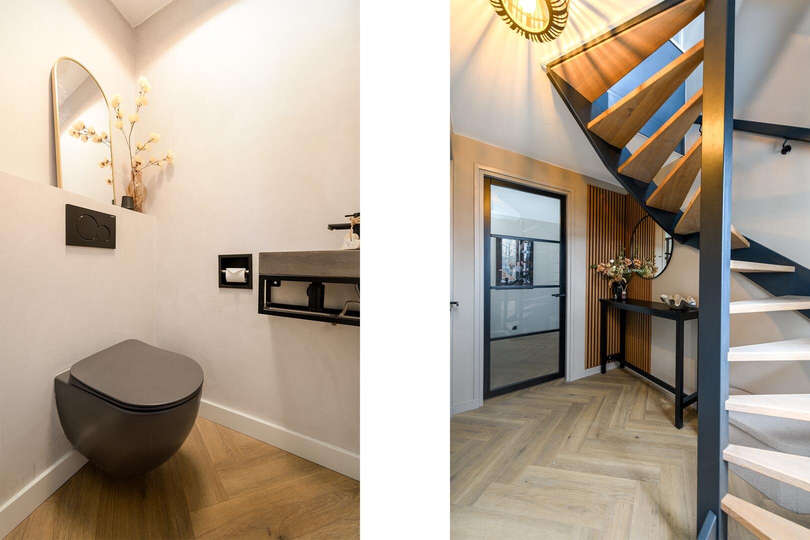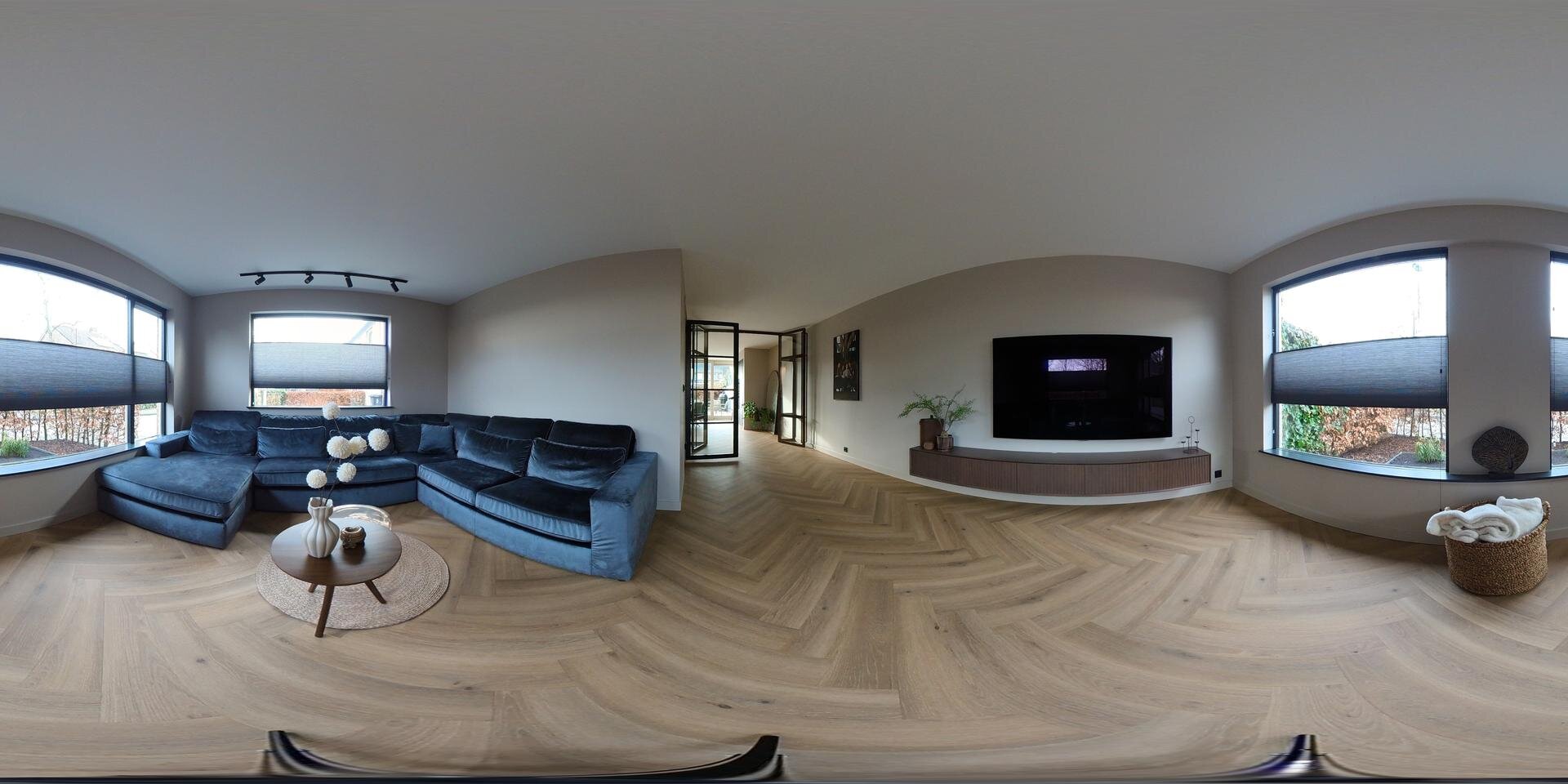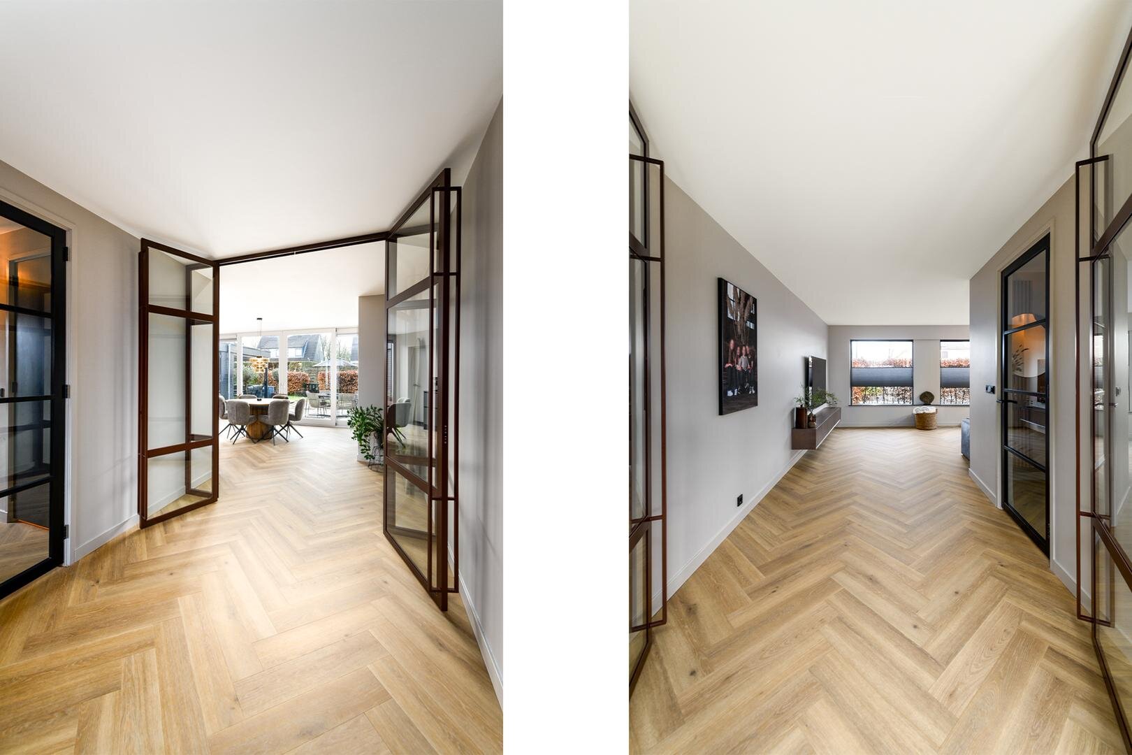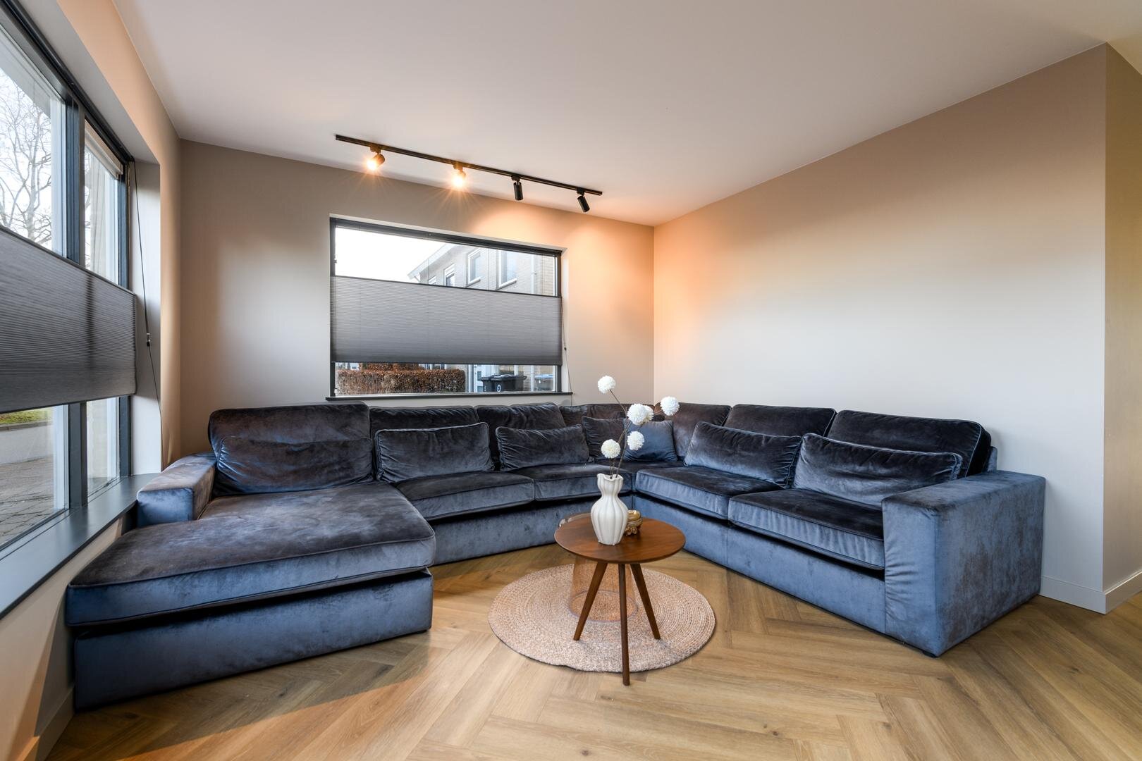 Entree, ruime hal met garderobe en trapopgang, Luxe toilet met fontein, dan volgen er glazen deuren in zwart, luxe pvc vloeren met vloerverwarming en zo komen we in de living. Hier vind je de zithoek voor, in een L vorm, met zicht op een besloten tuin waardoor veel privacy.