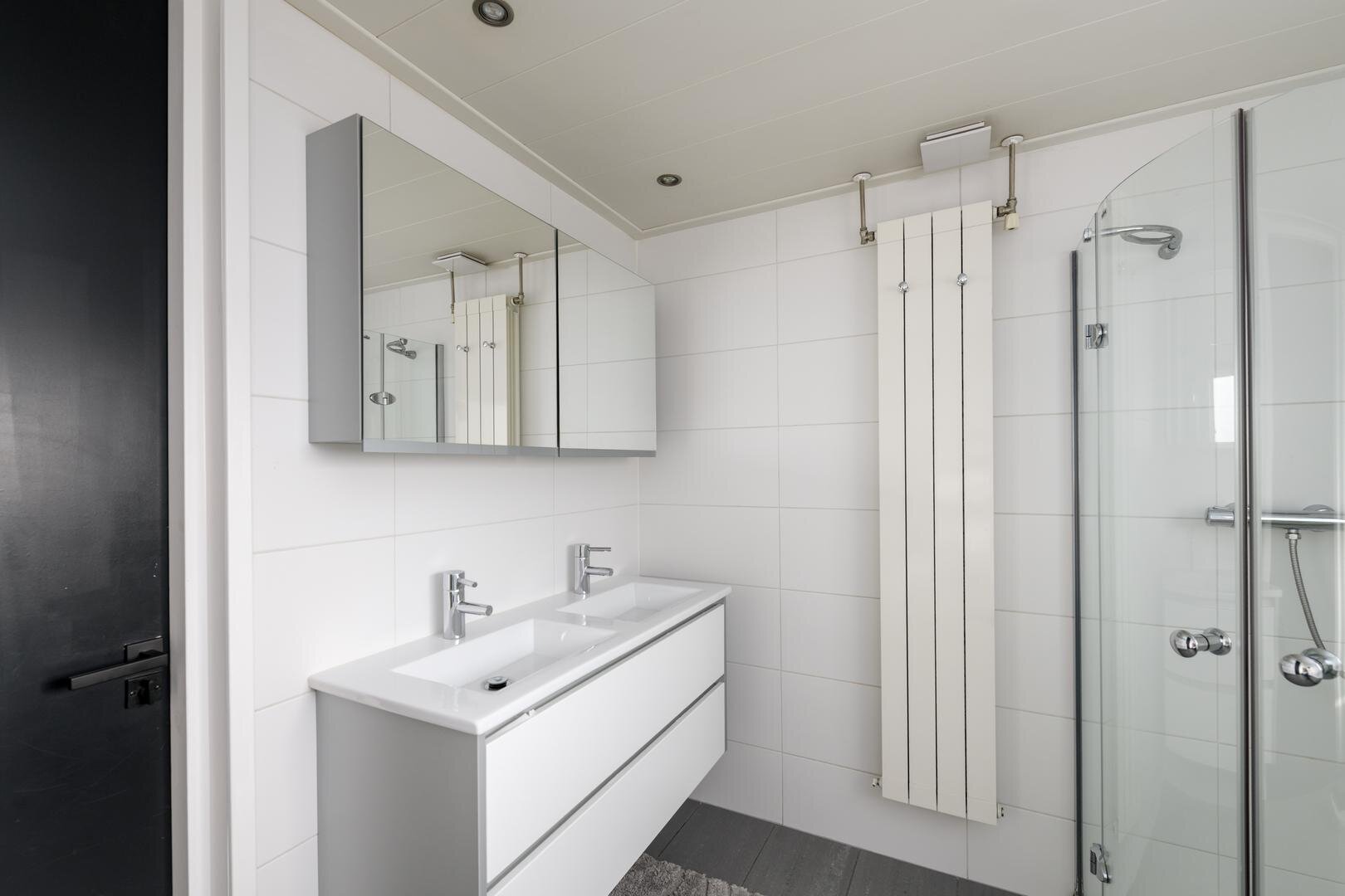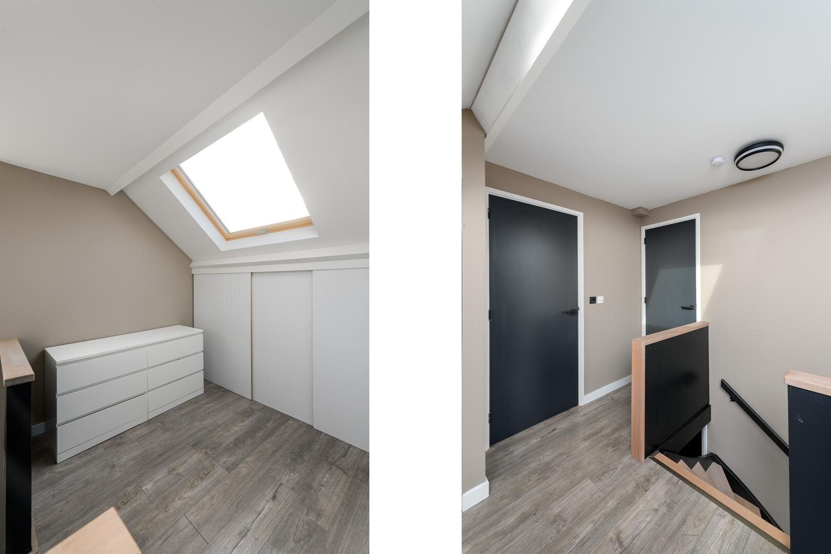 Op de verdieping is een ruime overloop en er zijn drie slaapkamers rondom. De badkamer is met een inloopdouche, een hoekbad, wastafelmeubel en een tweede toilet (2011). De verdieping is met laminaatvloeren. Met en vaste trap bereiken we de tweede verdieping, met hier nog eens twee ruime slaapkamers en veel bergruimte.