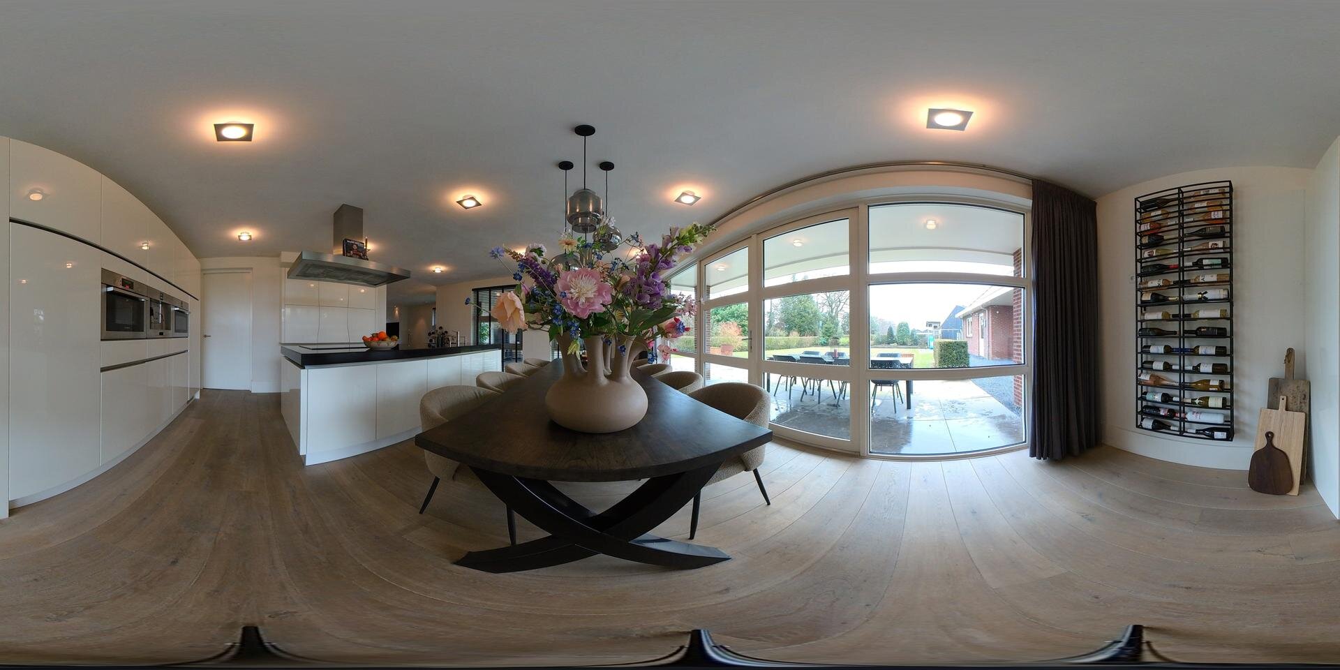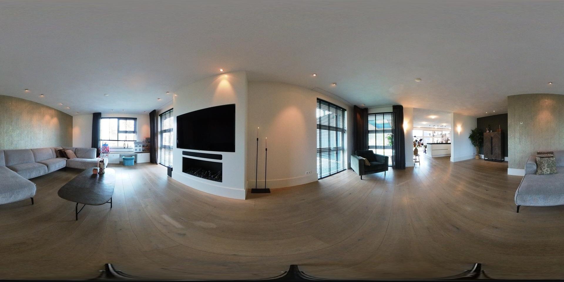 De living is opvallend ruim en in een L-vorm. De afwerking is met fraai stucwerk van wanden en plafonds. We zien inbouwspots, massief eiken vloeren, veel licht door het vele glas rondom. Ook vind je er een gezellige en grote gashaard met daarboven een ingebouwd TV scherm. Het wonen is aan de zonzijde met ramen tot op de vloer, waardoor je fraai zicht hebt op de tuinen en de omgeving.