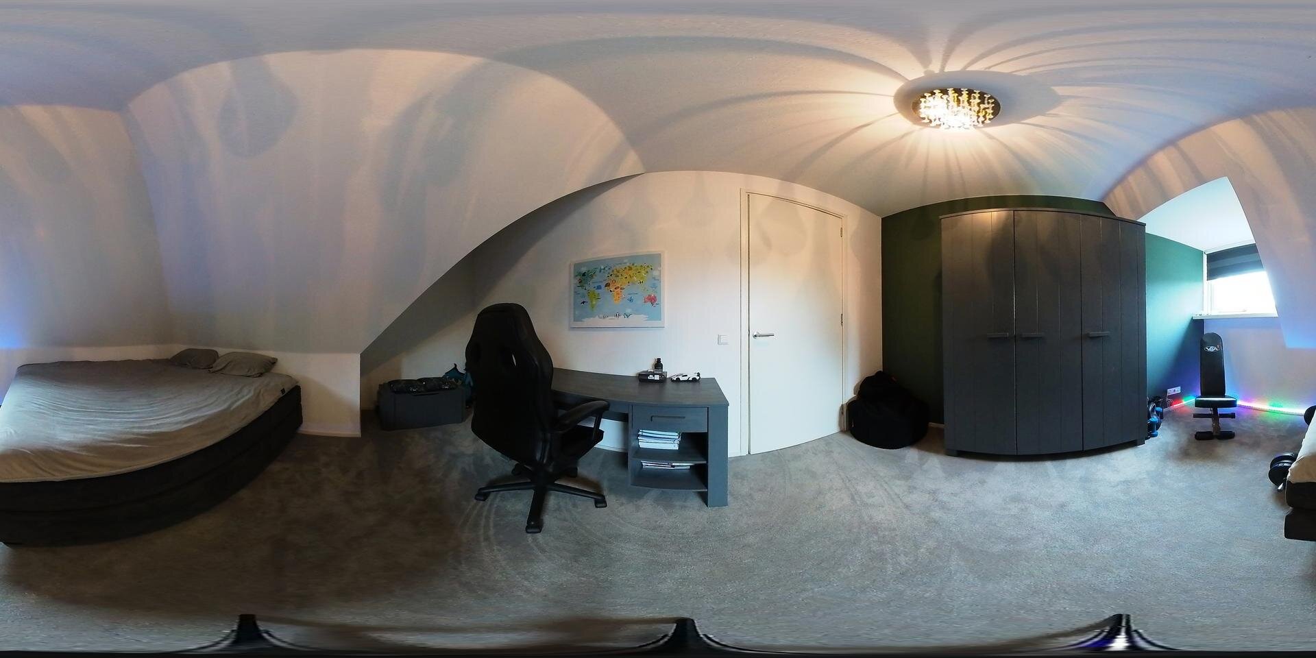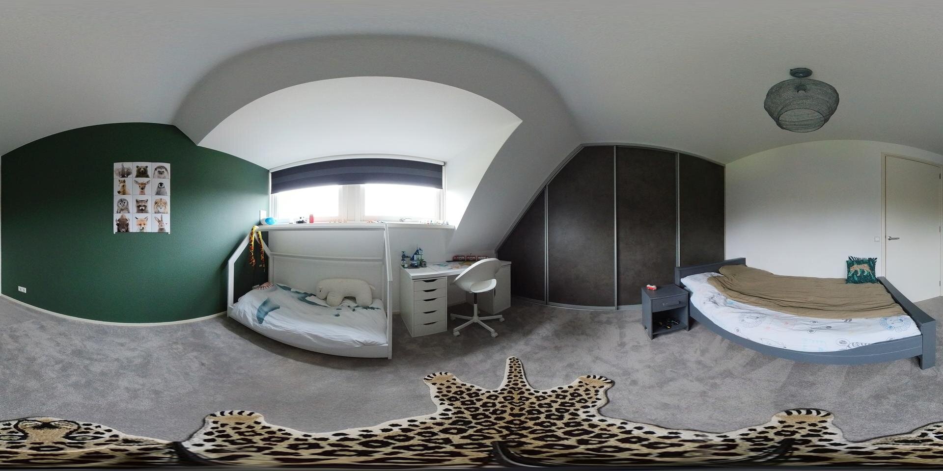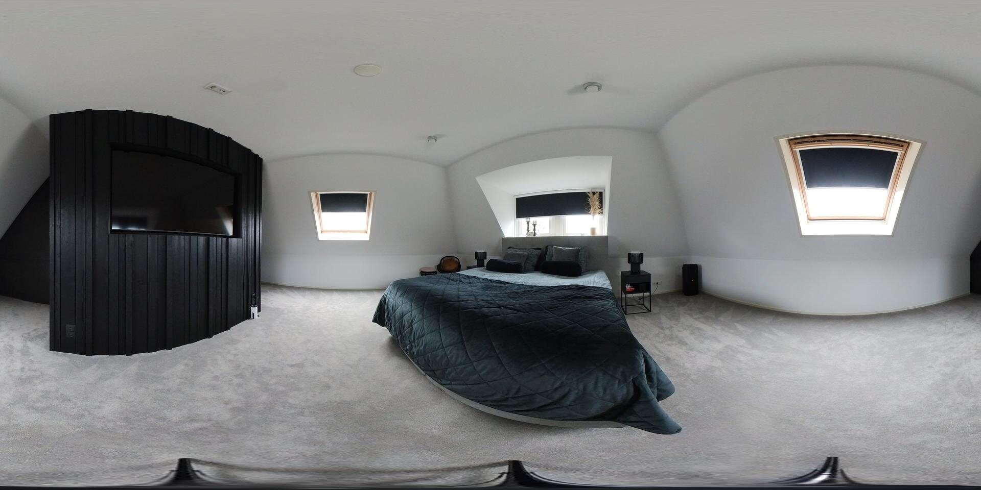 De de verdieping is het slaapgedeelte en hier beginnen we deze keer helemaal achterin met de master bedroom. Het is er ruim, onder de dakkapel, en met extra dakramen die goed te verduisteren zijn. De roomdivider verbergt de TV. Het deelt de ruimte heel subtiel op waardoor het hier wat meer cosy wordt. En natuurlijk ie er een ingebouwde kastenwand.
