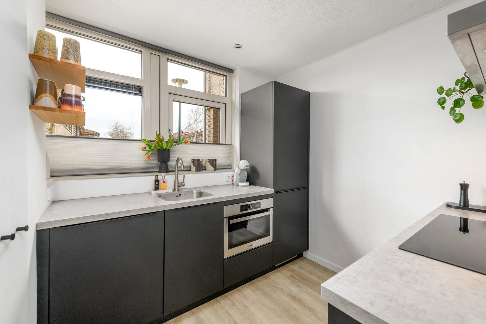 Dankzij de grote ramen geniet je hier van veel natuurlijk licht. De open keuken sluit naadloos aan op de woonkamer.